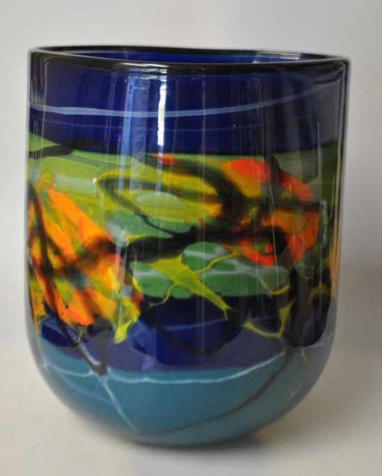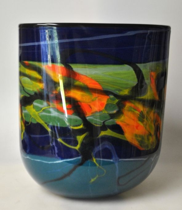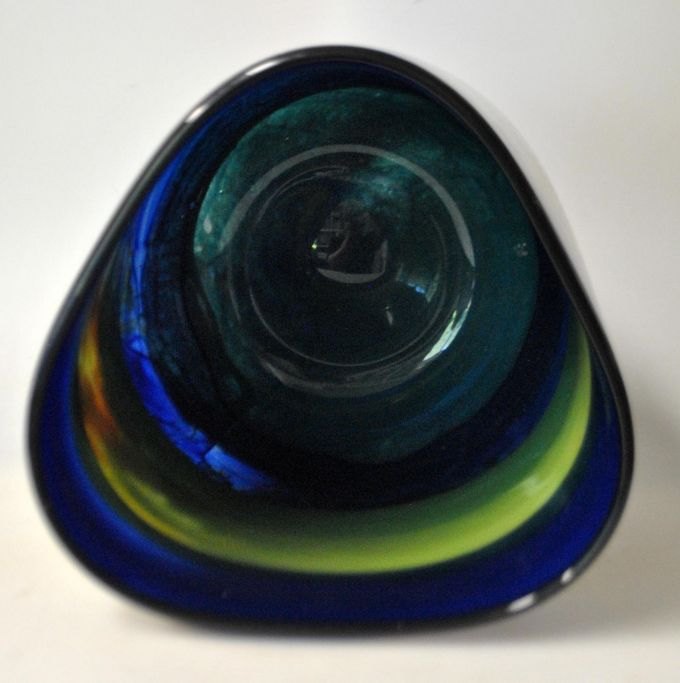 Nemtoi, Ioan (1964 - ) Romania: Glass vase in triangular shape. Glass in blue and green with yellow, orange and black swirls. Signed. H: 21.5 cm. W: 19 cm.