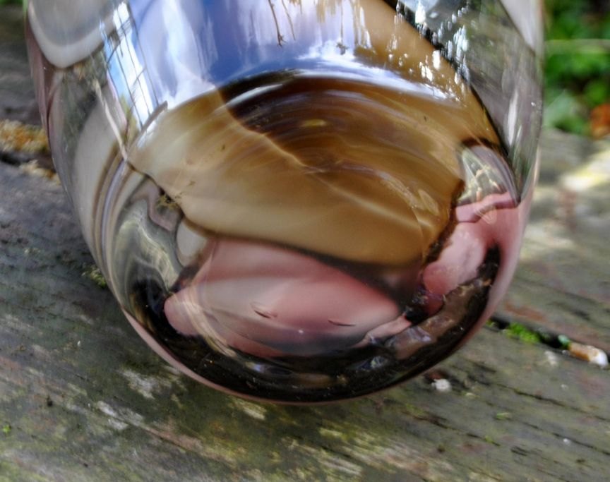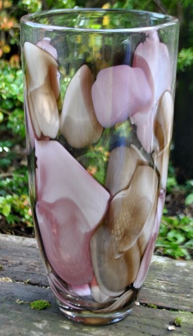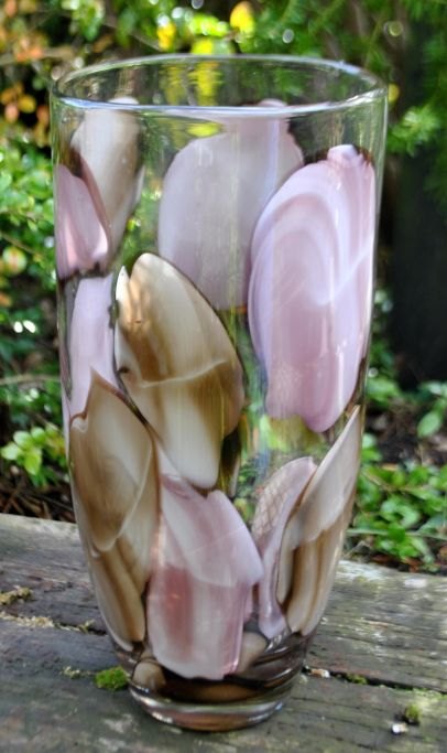 Glass vase with pink and brown decoration, 20th century. H: 30 cm. Dia: 14 cm.