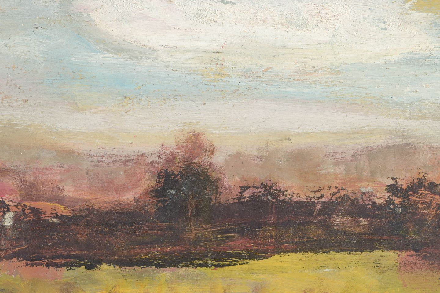 Atmospheric impressionist landscape with a low horizon beneath a luminous, softly dissolved sky. Warm earth tones in the foreground lead into a hazy pink-brown treeline, rendered with gentle, atmospheric brushwork. A poetic and tranquil nature scene focusing on mood and tonal harmony.