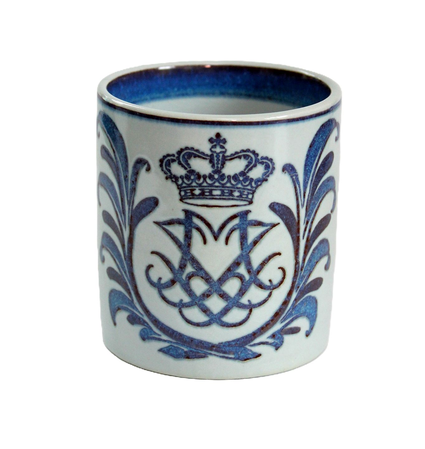 Text available in Danish: Aluminia, Lille årskrus i kunstfajance 1967. Speciel edition med Dronning Margrethes Monogram. Designer Nils Thorson. Nr. 3495. Højde 7,5 cm. Diameter 6,8 cm. Lettere overfladekrakelering. Pris: 800 kr. stk. Lager: 2