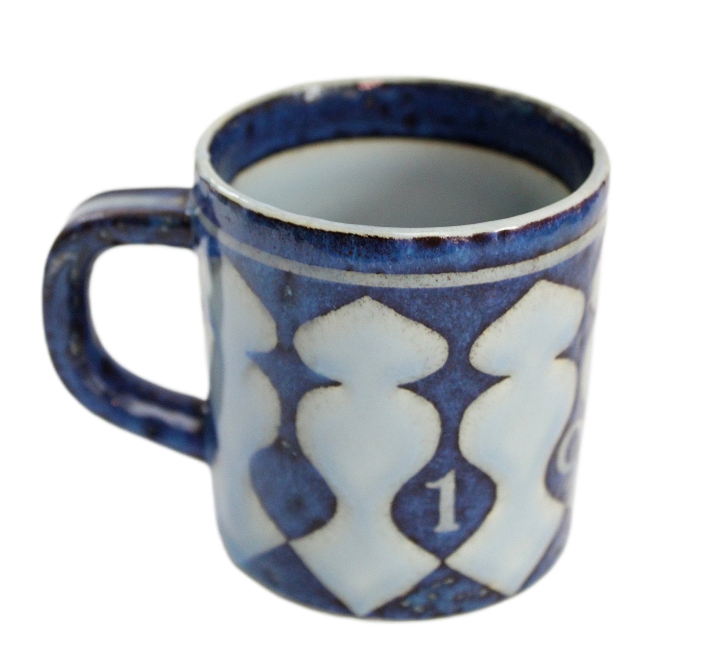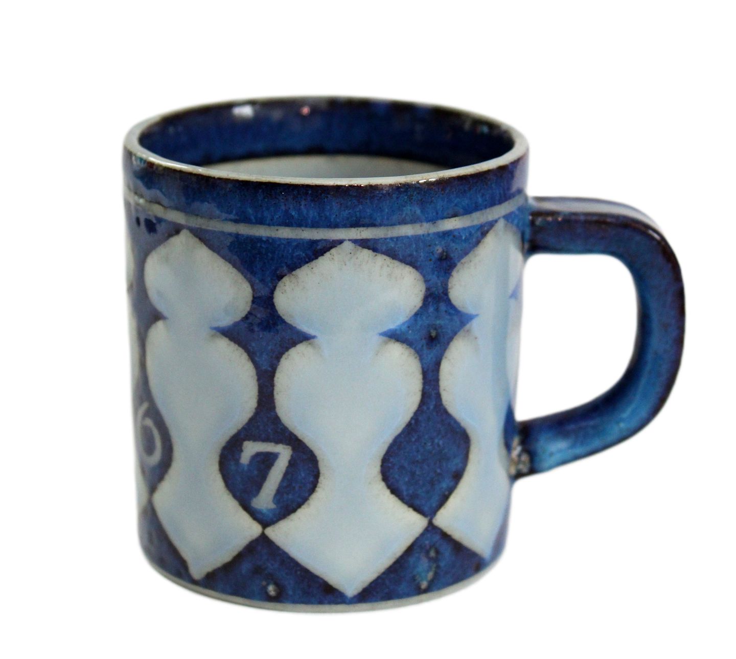 Text available in Danish: Aluminia, Lille årskrus i kunstfajance. Designer Nils Thorson. Dette er det første årskrus. Nr. 3495. Årskrus er produceret fra perioden 1967 til 2014, fra 1968 er det Royal Copenhagen. Højde 7,5 cm. Diameter 6,8 cm. Lidt ujævn bemalet kant. Pris: 700 kr. stk. Lager: 1