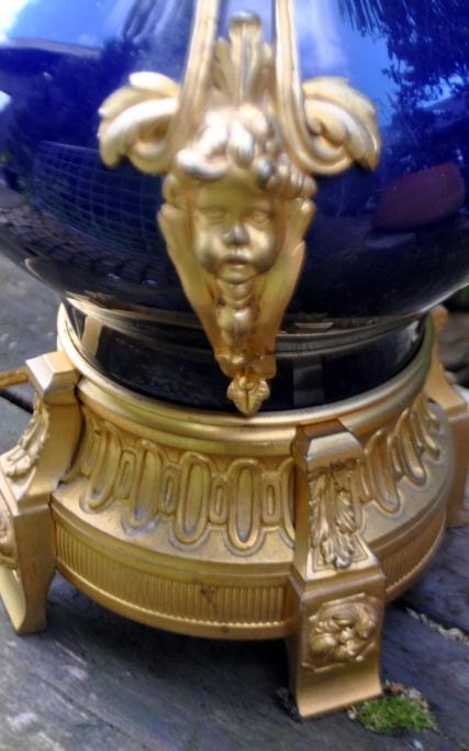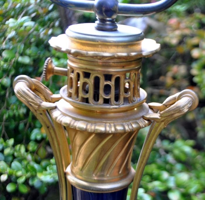 French table lamp, 19th century. Former kerosene lamp, converted to electric. Gilded bronze and body in blue porcelain. With beautiful decorations of angels. H.: 65 cm.