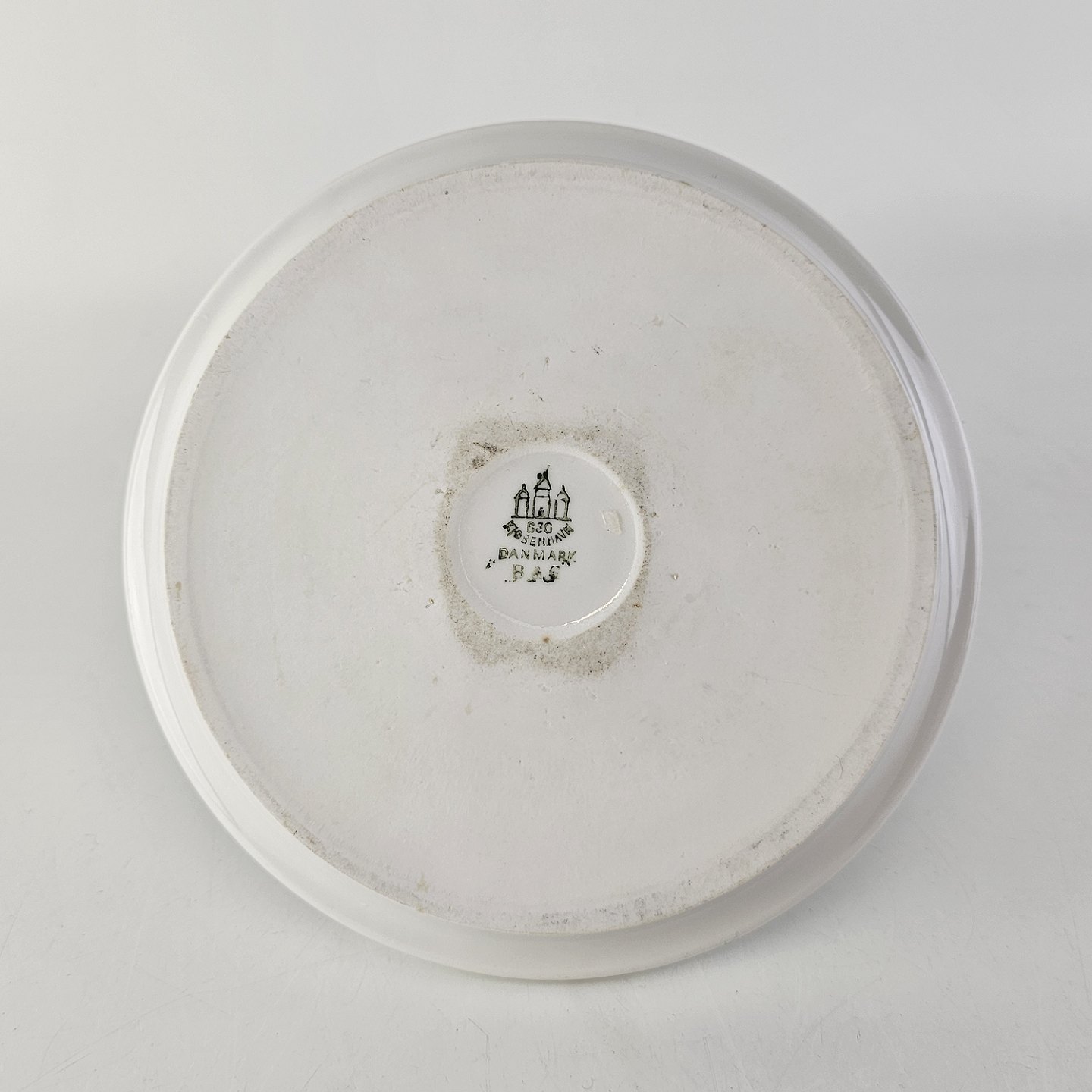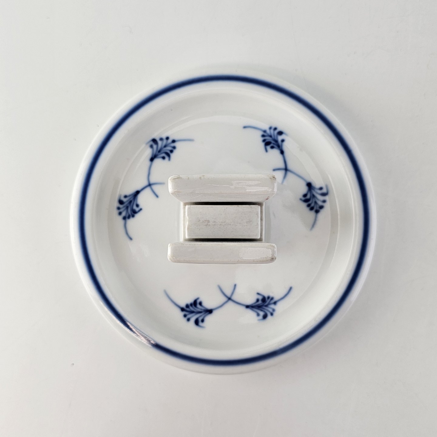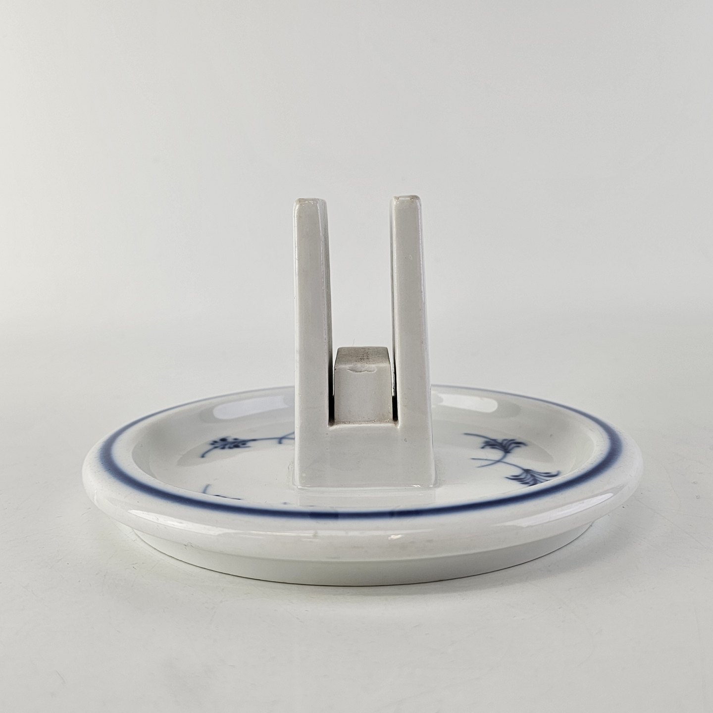 Text available in Danish: Tandstikkeholder i hotelporcelæn med motiv fra restaurant Kilden i Aalborg fra stellet Blåmalet