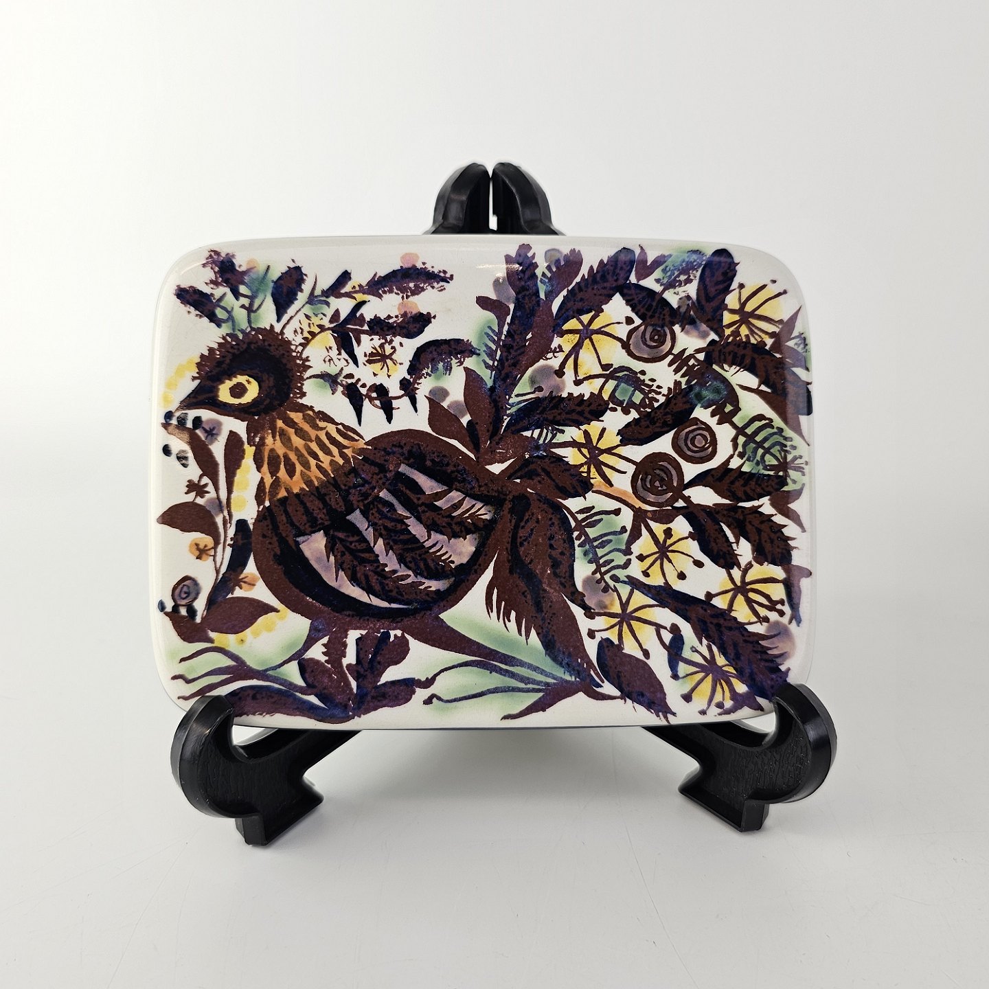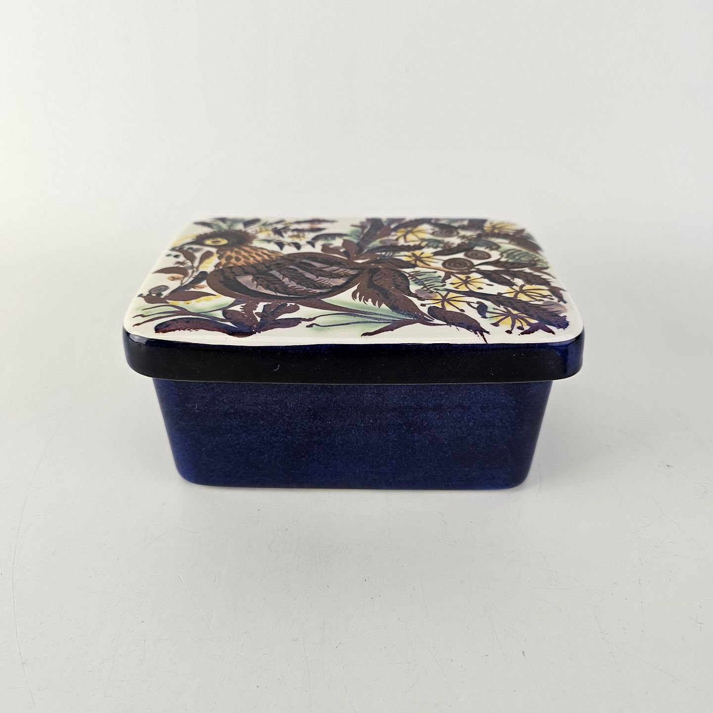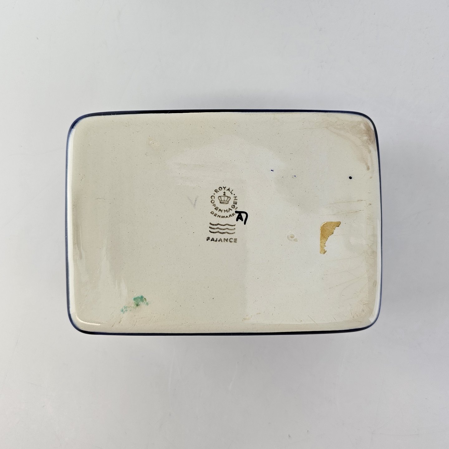 Text available in Danish: Smørboks fra serien Tenera. Boksen er i hvid fajance med blåmalet yderside og låget er dekoreret med motiv af en påfugl