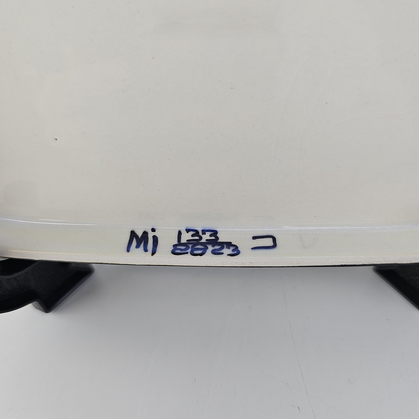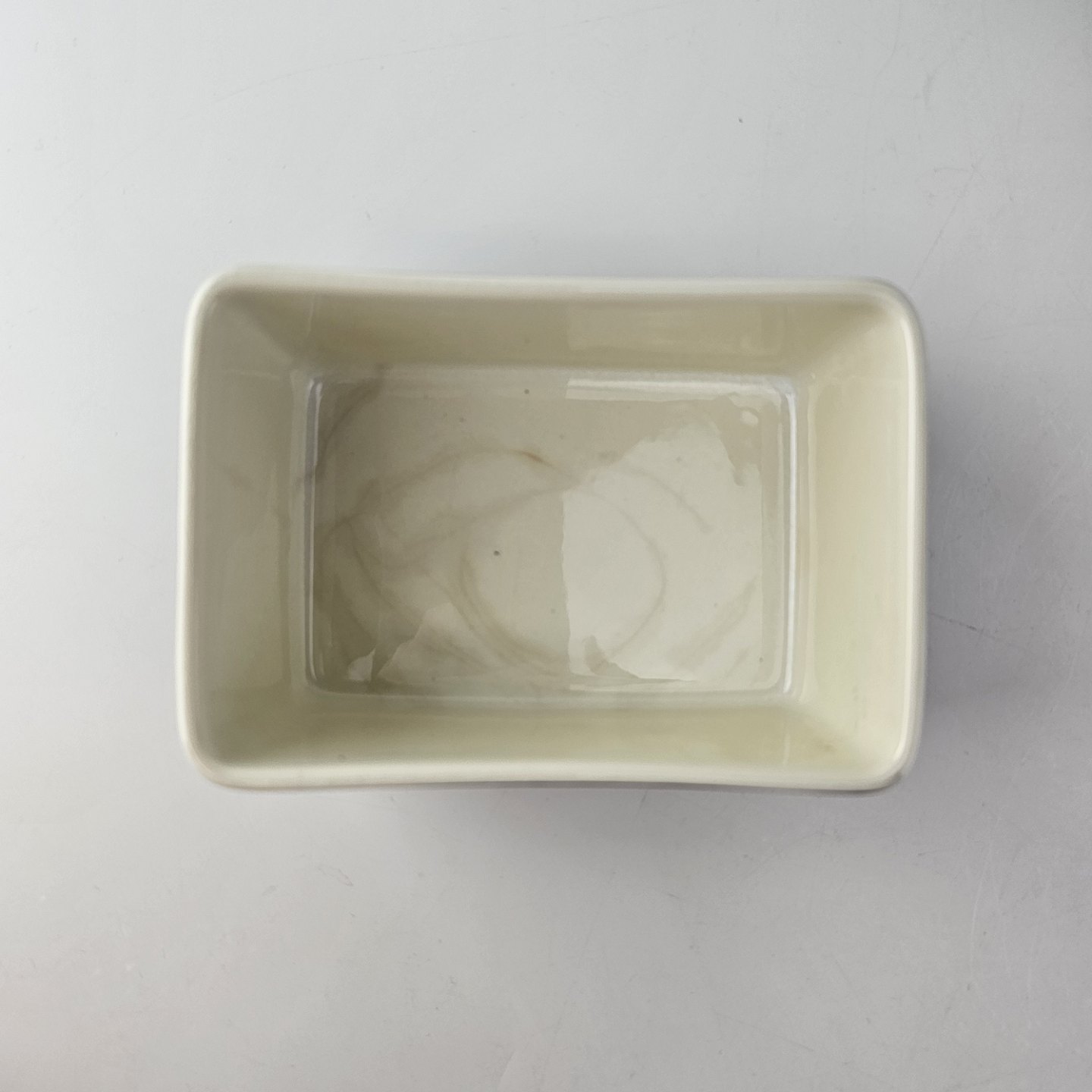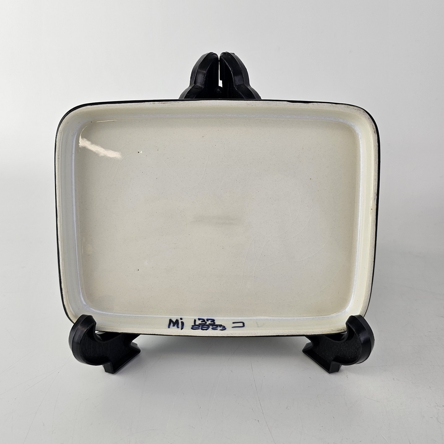 Text available in Danish: Smørboks fra serien Tenera. Boksen er i hvid fajance med blåmalet yderside og låget er dekoreret med motiv af en påfugl