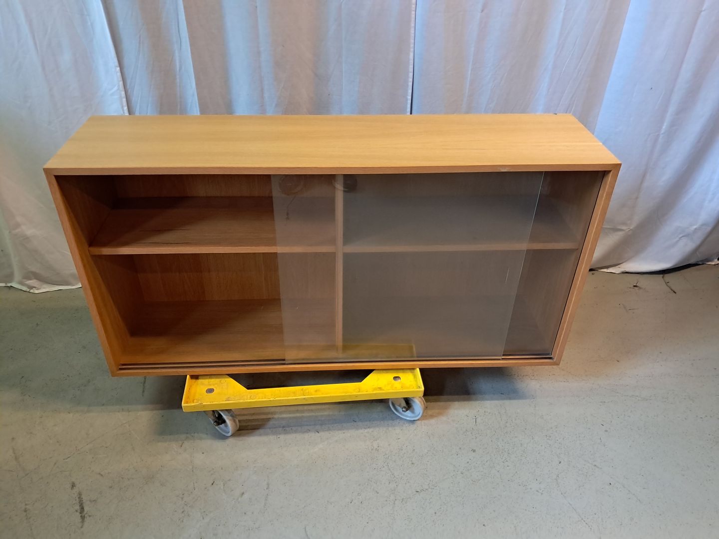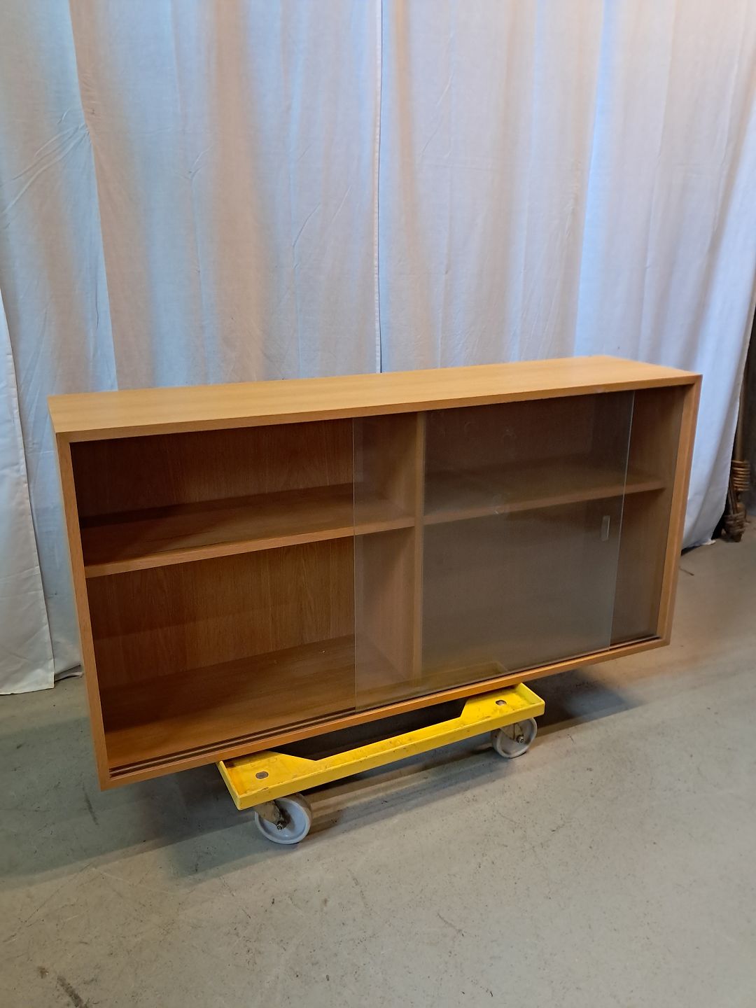 Reol i fineret egetræ med glaslåger, fra 1990erne.