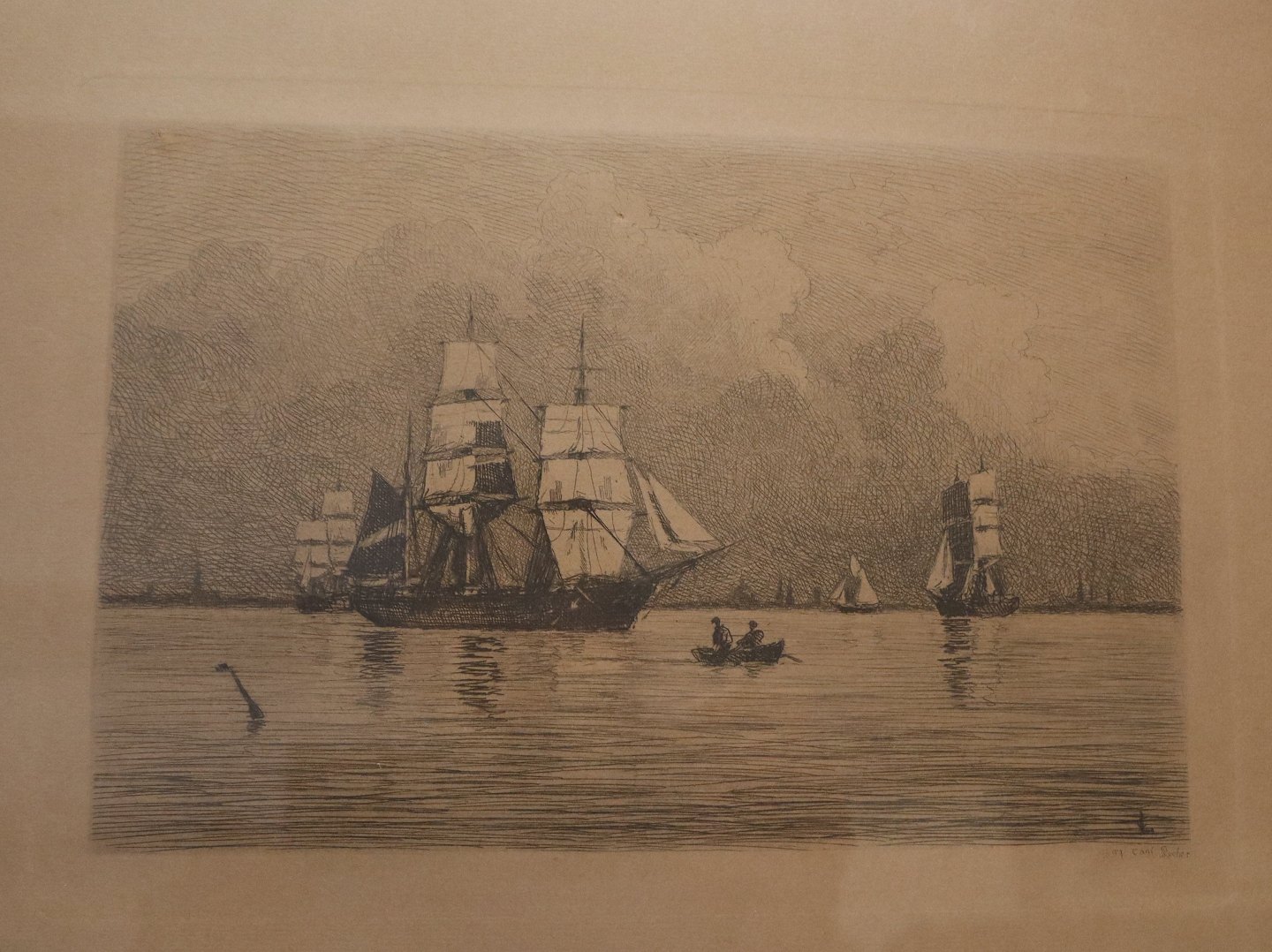 Etching: Carl Locher 1907 Marine motivf with sailships 45 x 41 cm including original glass and frame