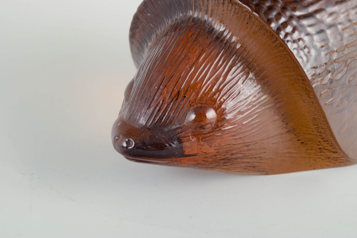Hand-cast art glass figure of a hedgehog in warm amber glass with softly textured matte back and smooth polished front, produced in collaboration with the World Wildlife Fund. Naturalistic yet stylised form language.