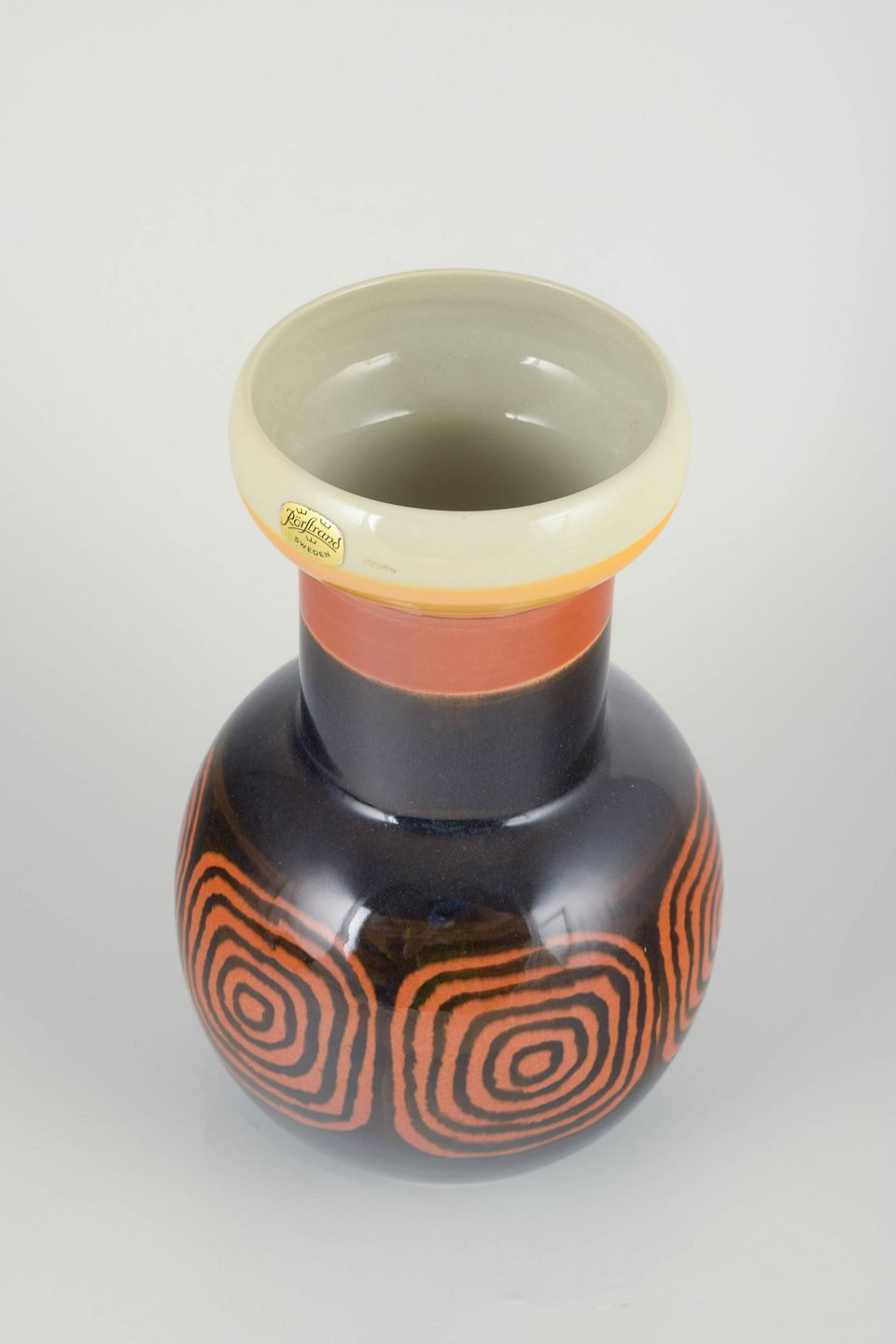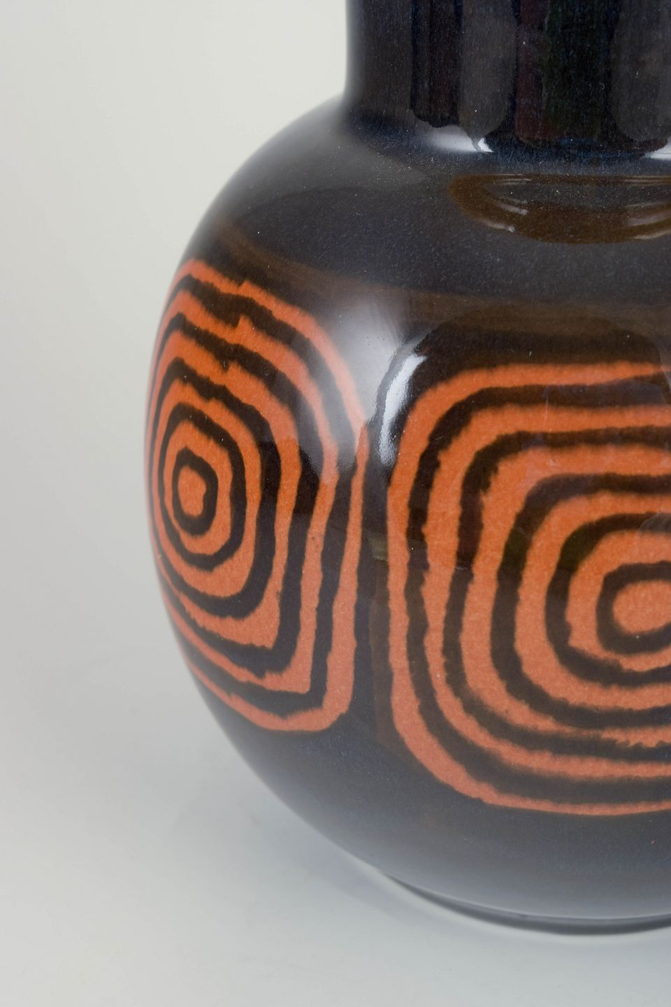 Wheel-thrown stoneware vase with deep dark glaze and hand-painted terracotta-toned geometric spiral decoration. Contrasting pale glazed collar with original label preserved.