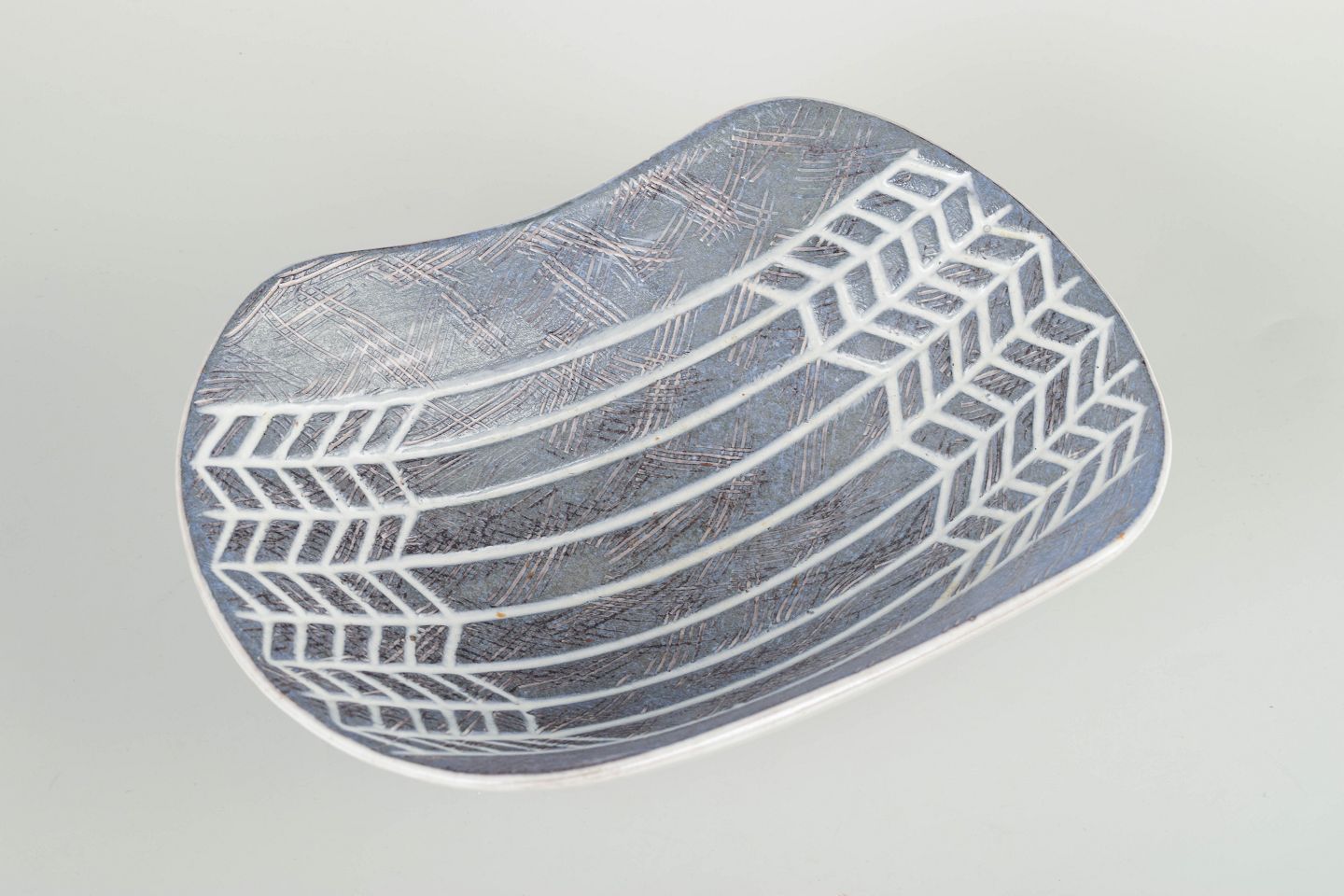 Organic form with concave sides and grey-blue incised geometric decoration.