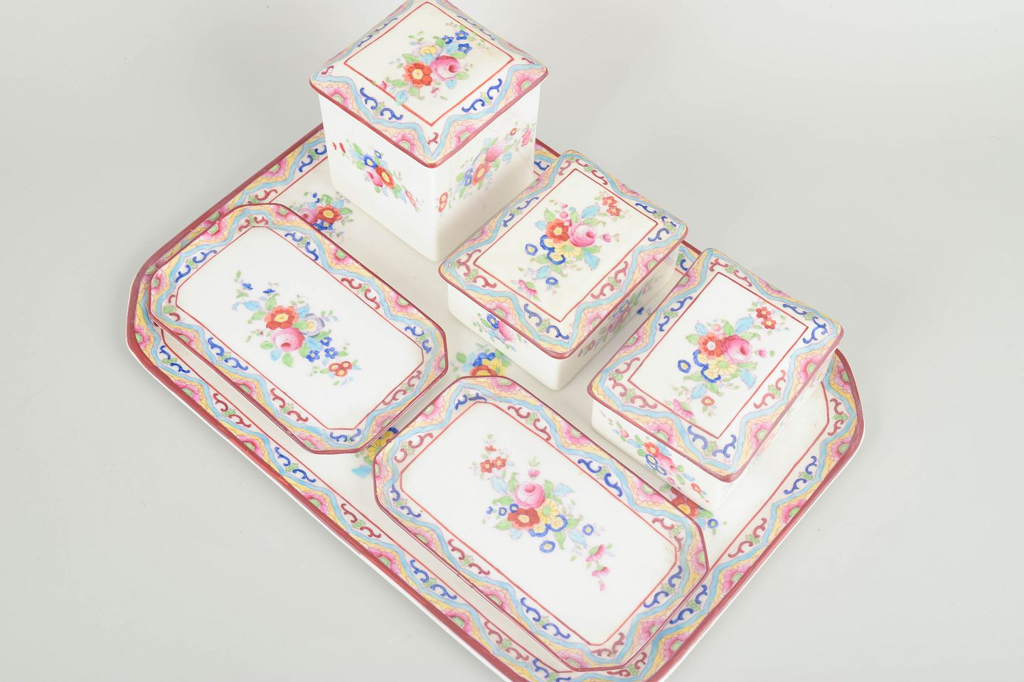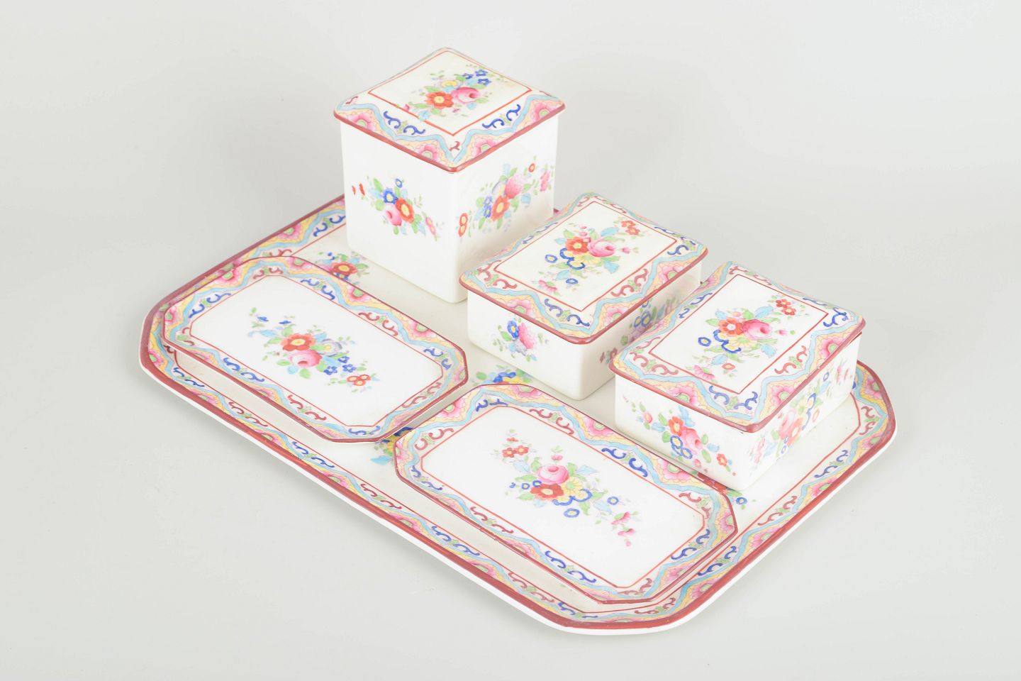 Rectangular tray with four lidded boxes in varying sizes. White porcelain with polychrome floral decoration and a characteristic flowing border in Art Deco / chinoiserie style — commonly referred to as the “Peacock” pattern.
