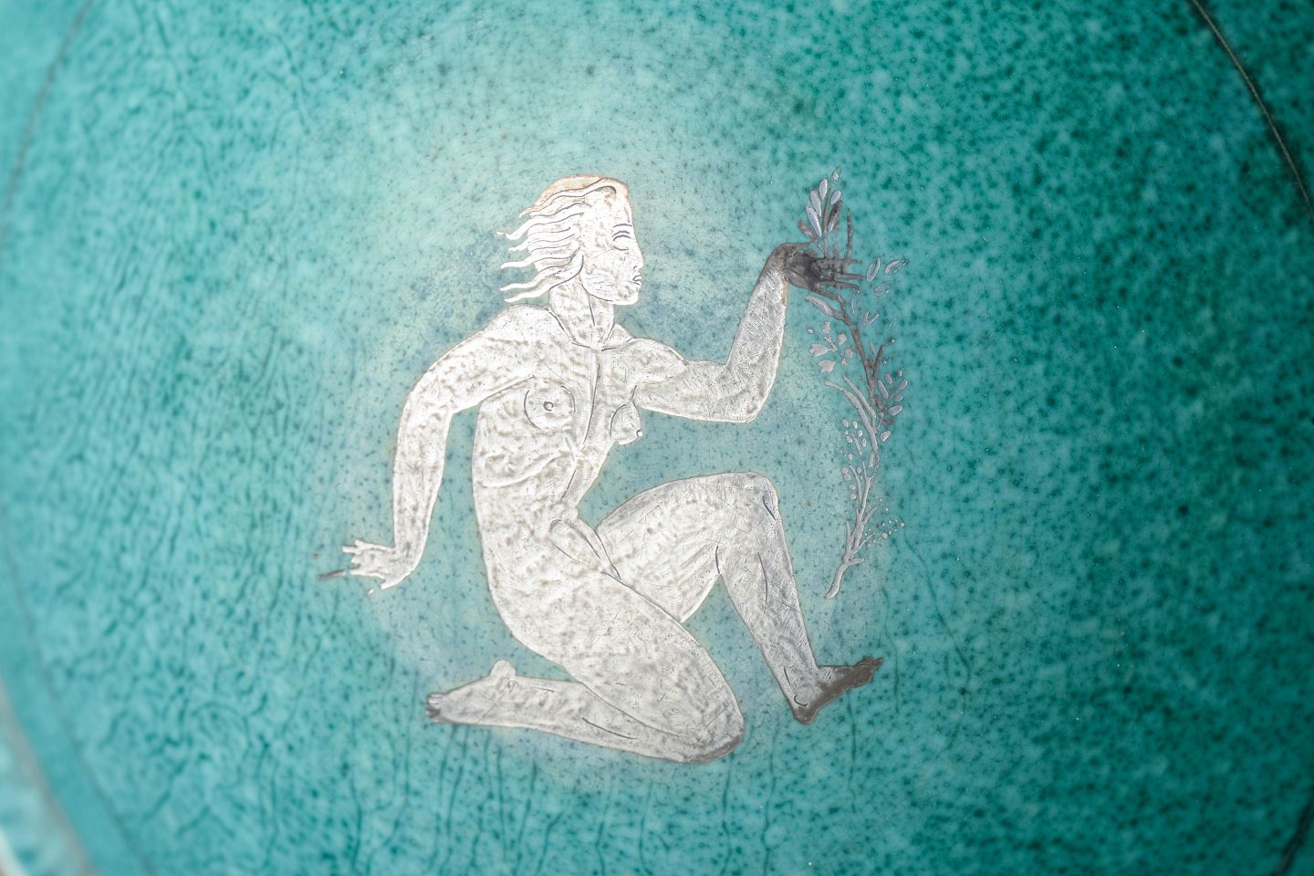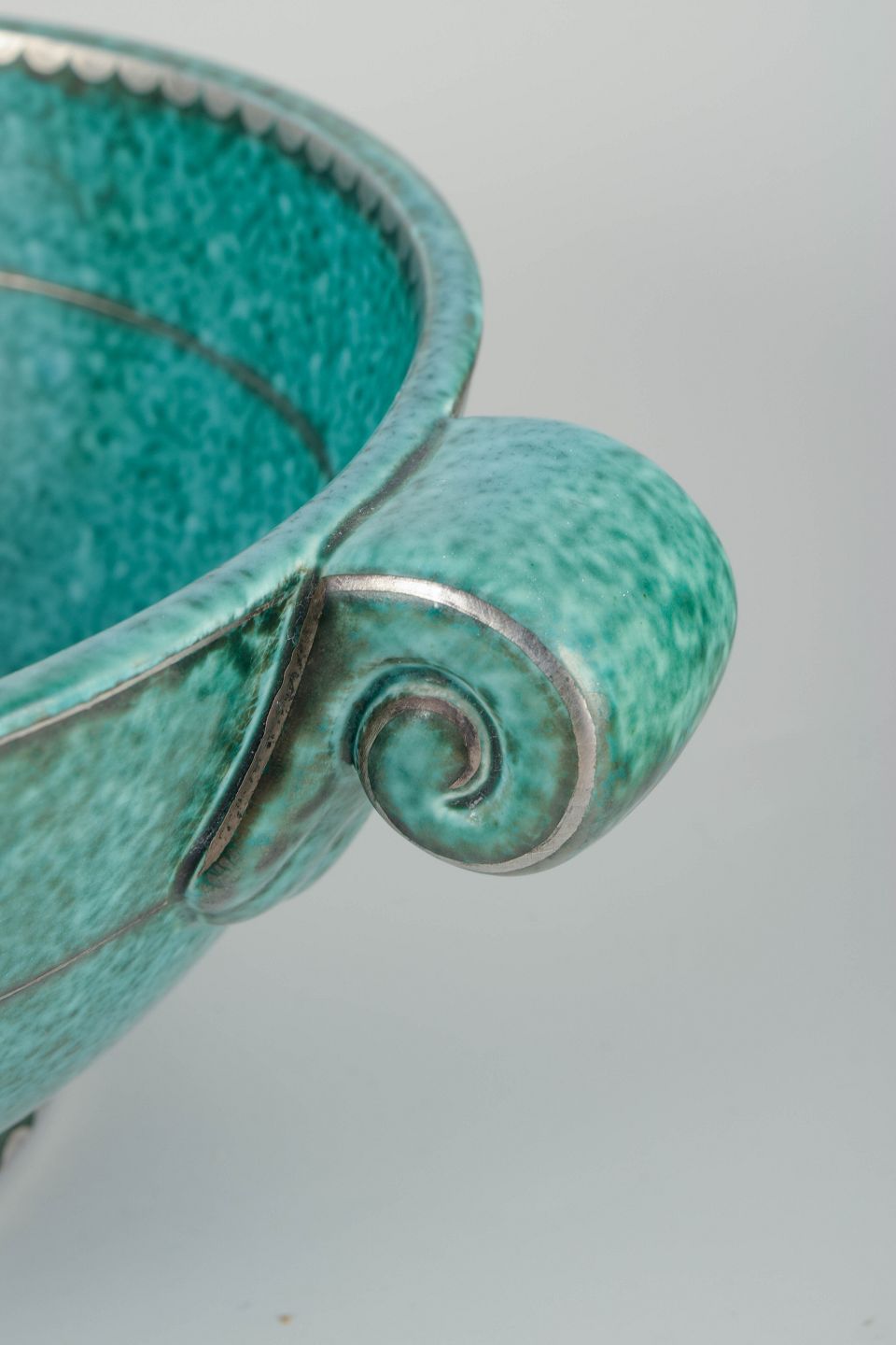 Stoneware with turquoise glaze and inlaid silver decorations, exterior featuring hand-incised female figure and stylised branch motif. Elegant scroll handles in classic Art Deco style.