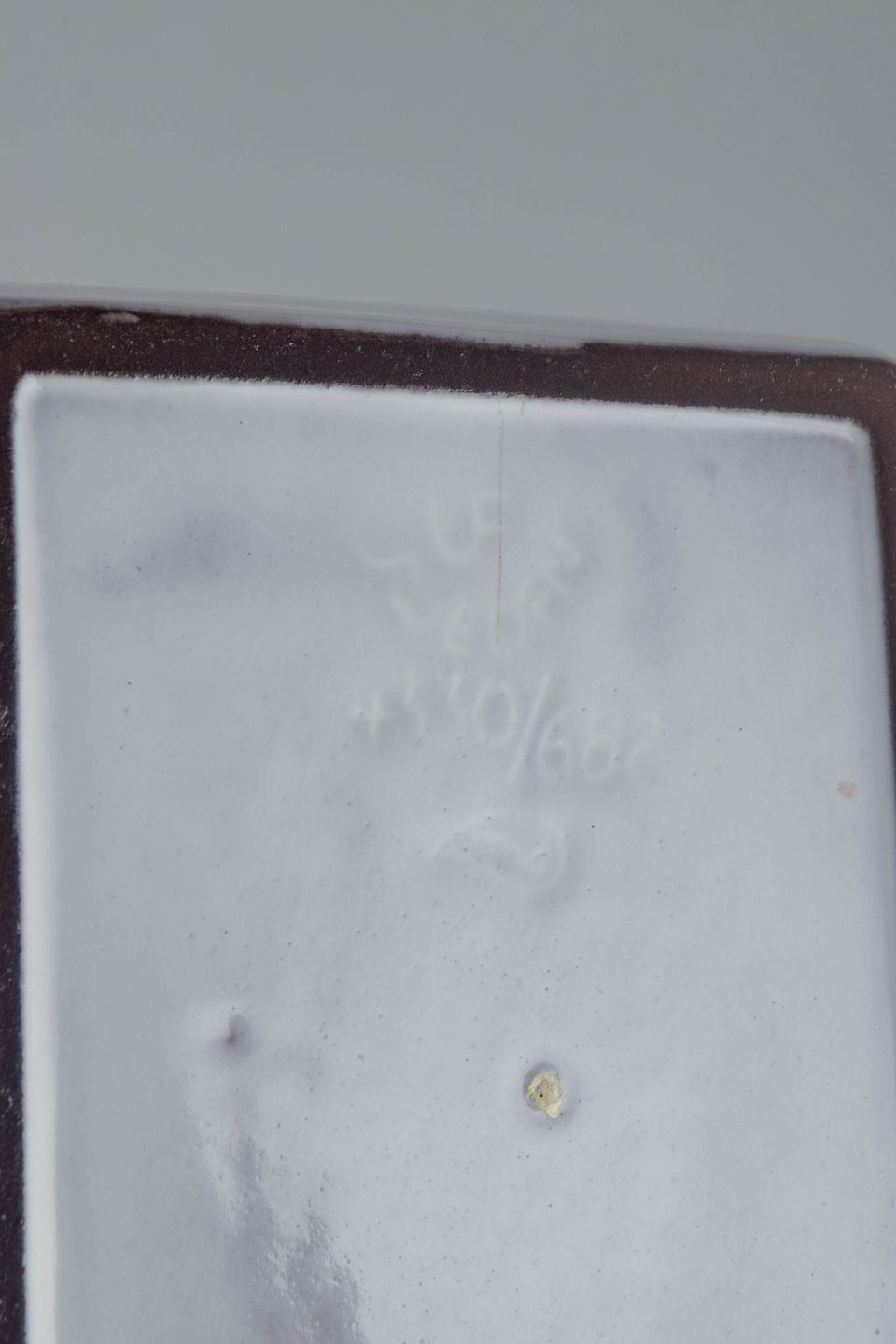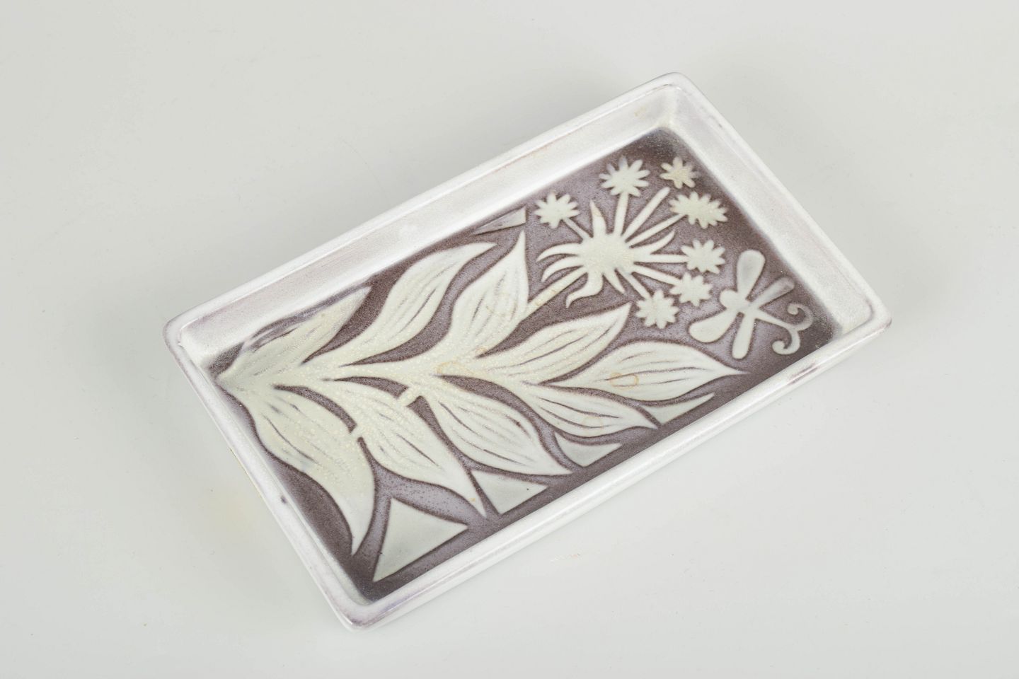 Relief-decorated stoneware with stylised floral and insect motif in white and grey glaze.