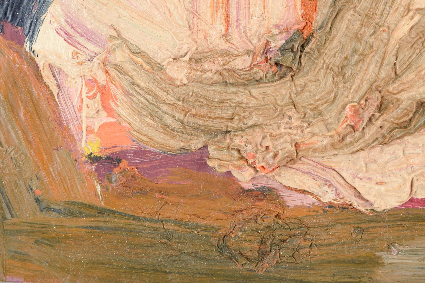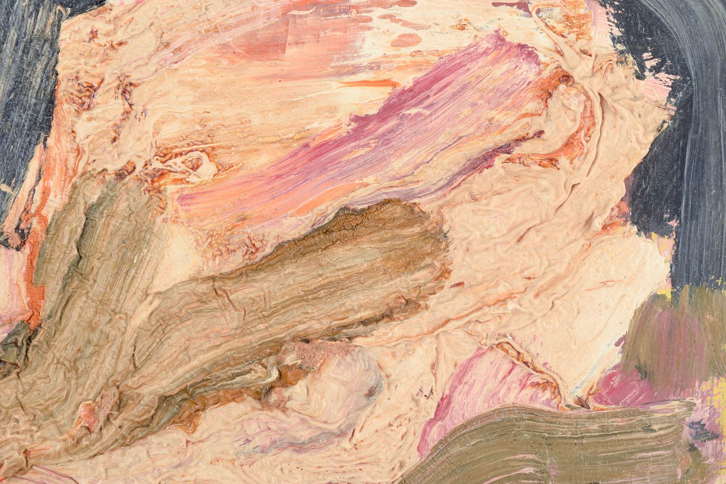 A raw and expressive abstract painting executed with heavy impasto brush and palette-knife work. The palette is dominated by flesh tones, earth colours and dark blue/black, suggesting an organic, perhaps figurative or landscape-like composition. The tactile surface and physical application of the paint evoke the European post-war informel / abstract expressionist tradition.
