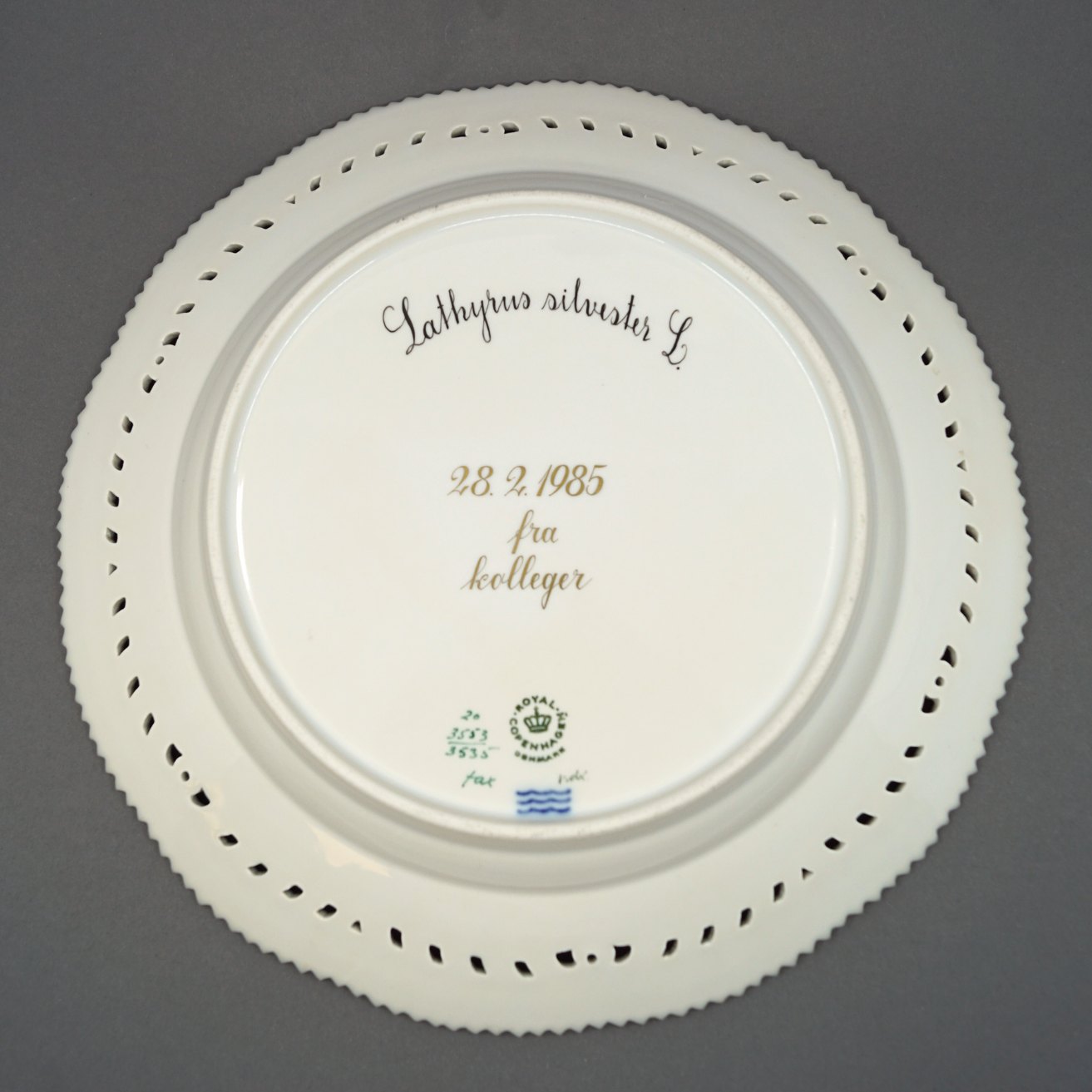 Royal Copenhagen, Flora Danica porcelain; Dinner plate #3553 with pierced border. Decoration: Lathyrus silvester L. Decorated in colours and gold with flowers. Diam 25 cm.
