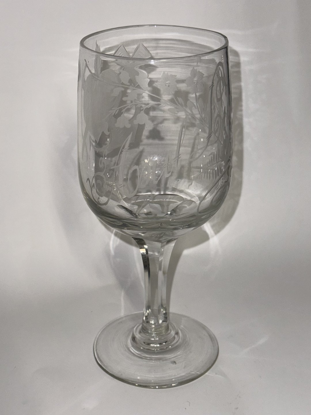 Gammelt vinglas fra Aalborg Glasværk fra omkring 1900. Dekoreret med navnet “Axel Ludvig”.