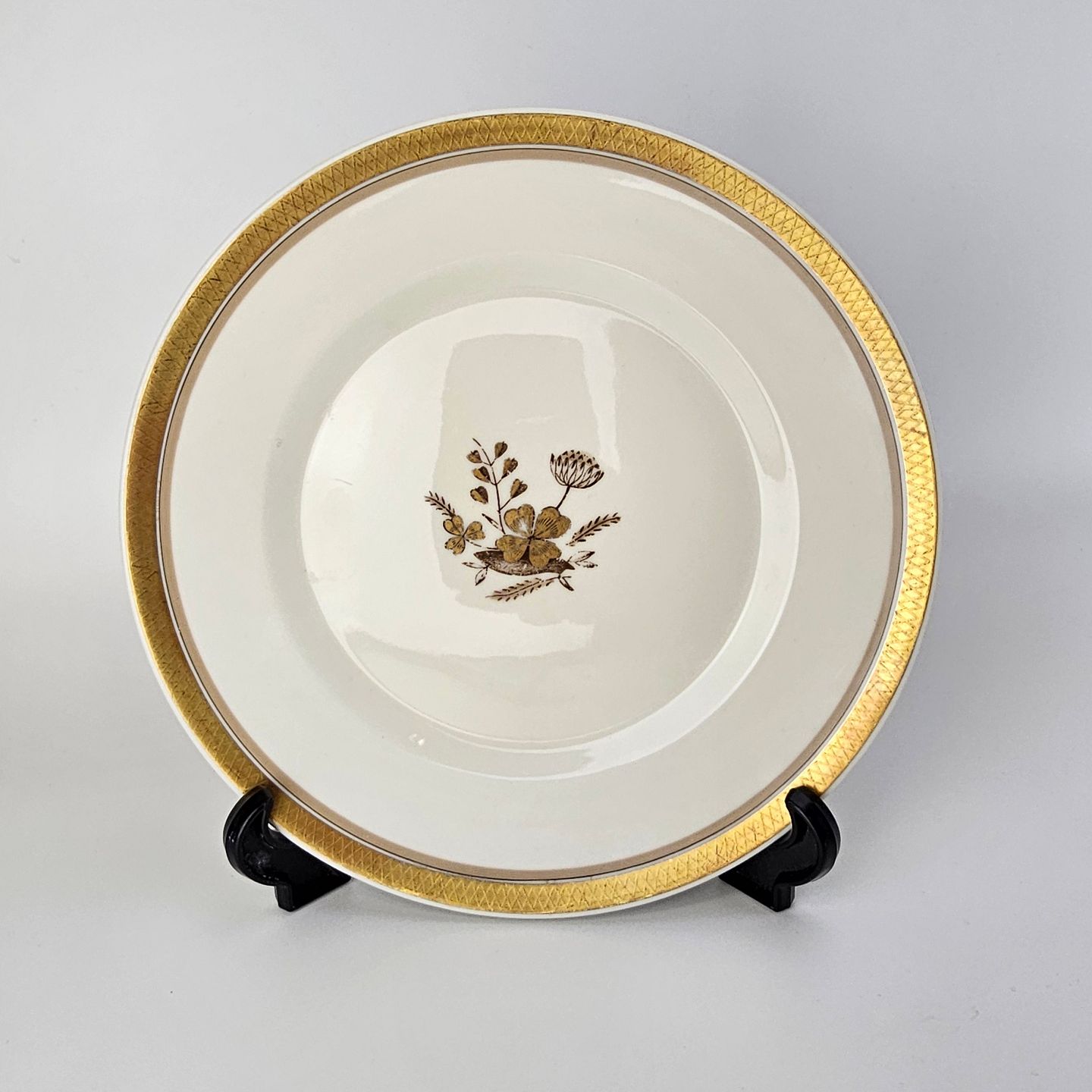 Cremefarvet porcelæn med motiv af gylden kløverblomst og bred graveret guldkant.