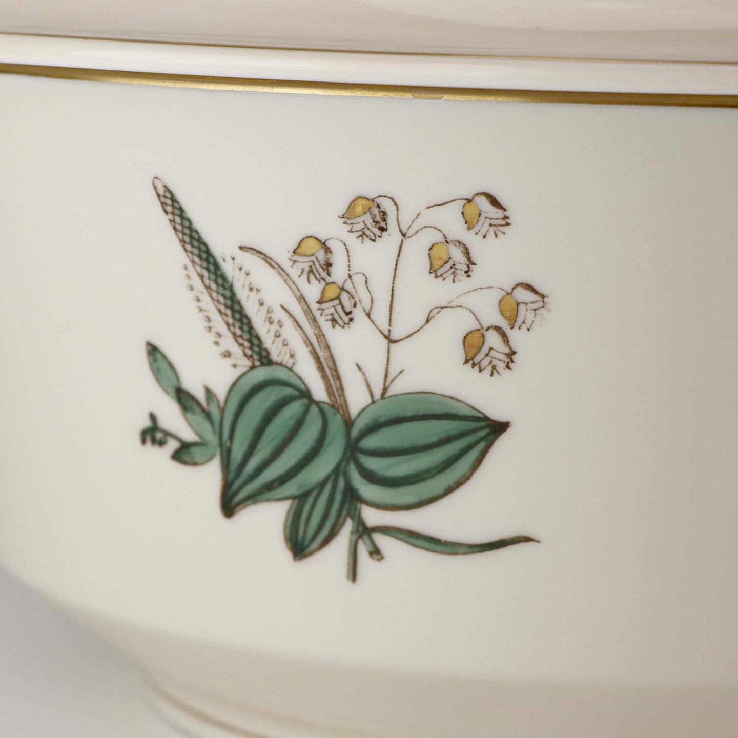 Stel i glat råhvidt porcelæn dekoreret med lysegrøn stribe og guldkant samt motiv af hjertegræs.