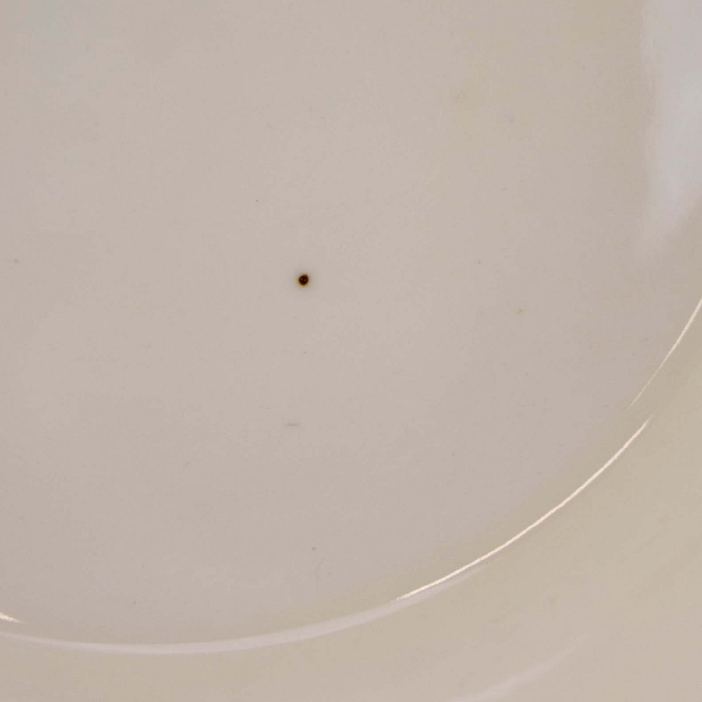 Fremstår med uenshed i glasuren på låget, tre brune pletter under glasuren på indersiden samt lettere slid på guldkanten ved den ene hank.