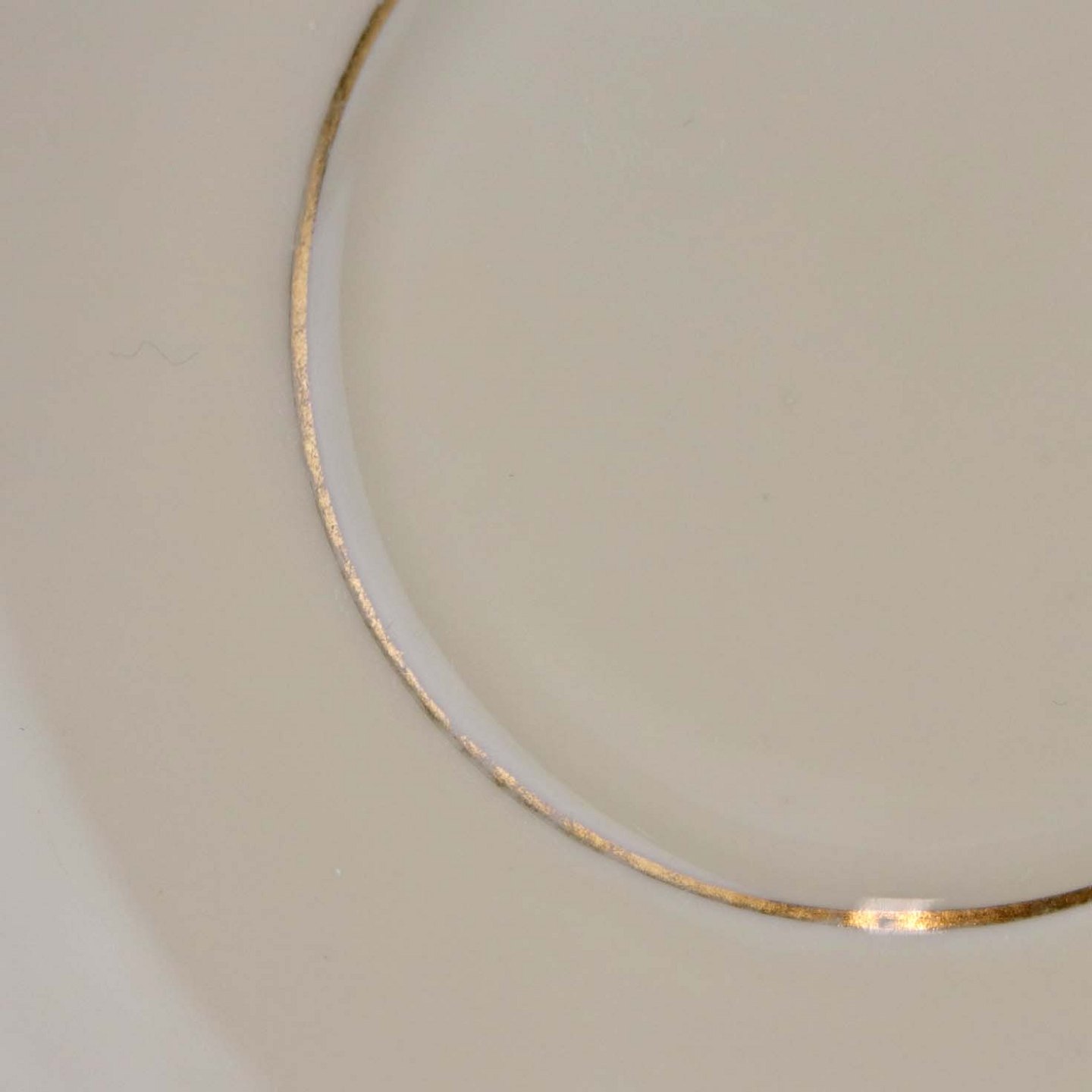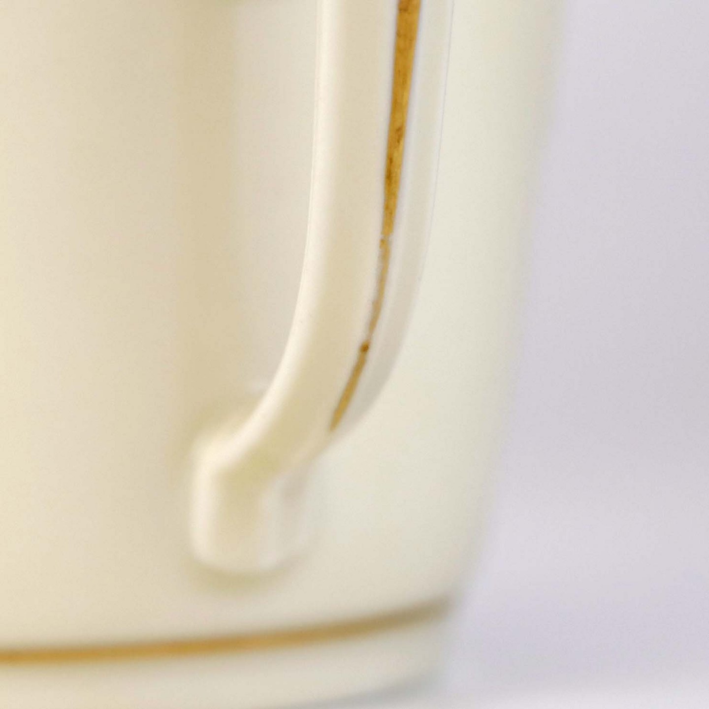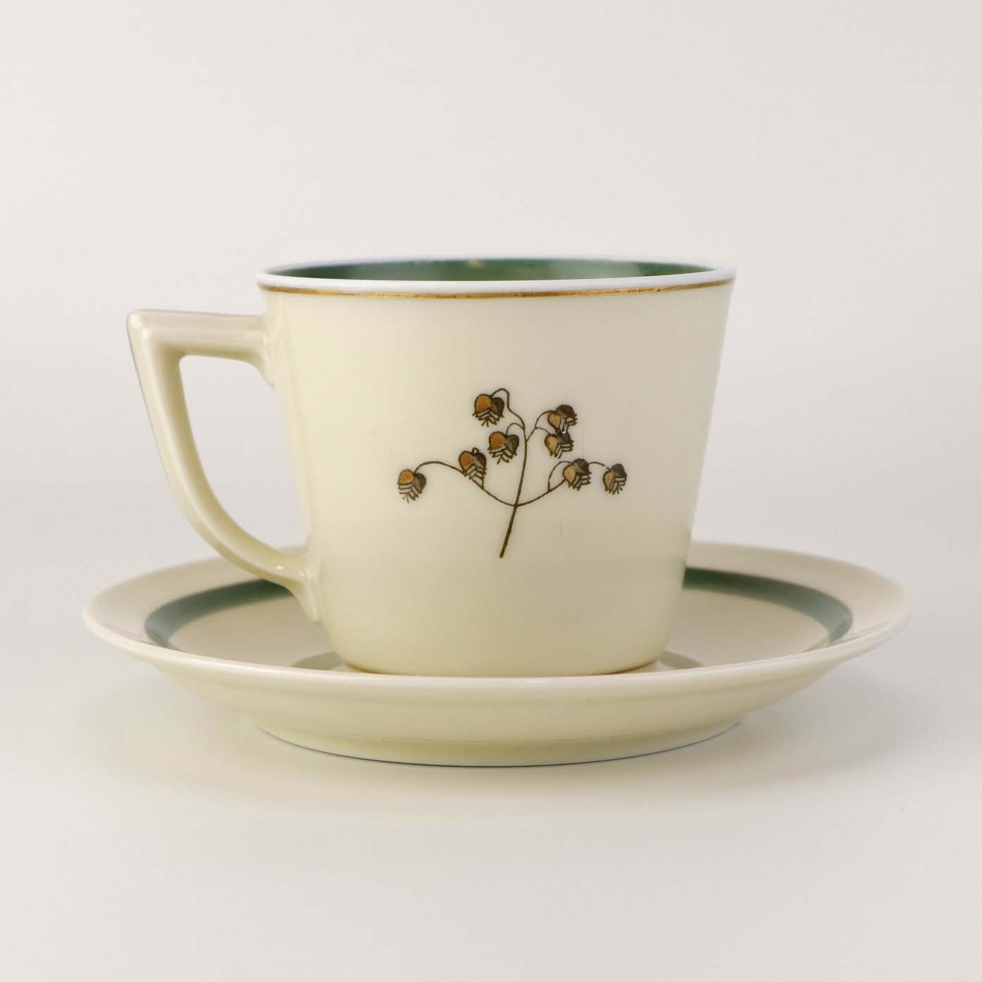 Stel i glat råhvidt porcelæn dekoreret med lysegrøn stribe og guldkant samt motiv af hjertegræs.