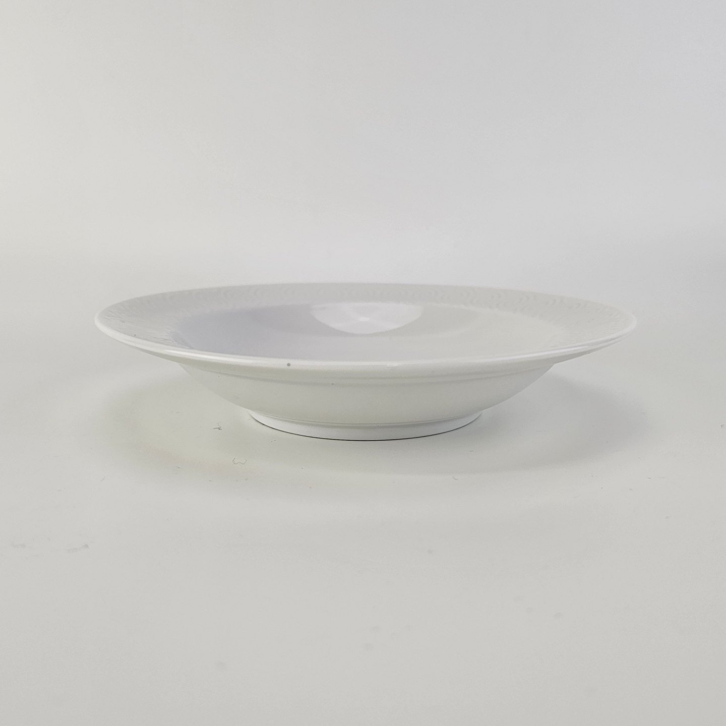 Service i glat hvidt porcelæn med geometrisk mønster på kanten