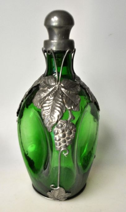 Art deco triangular green bottle with pewter mounting, 1930s, Denmark.