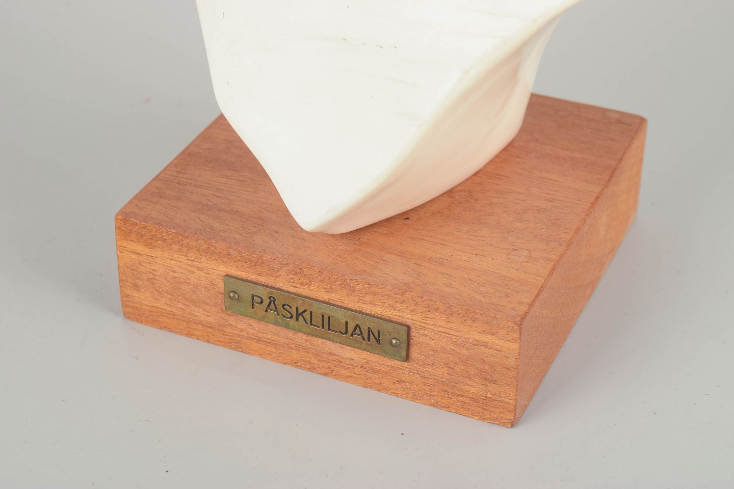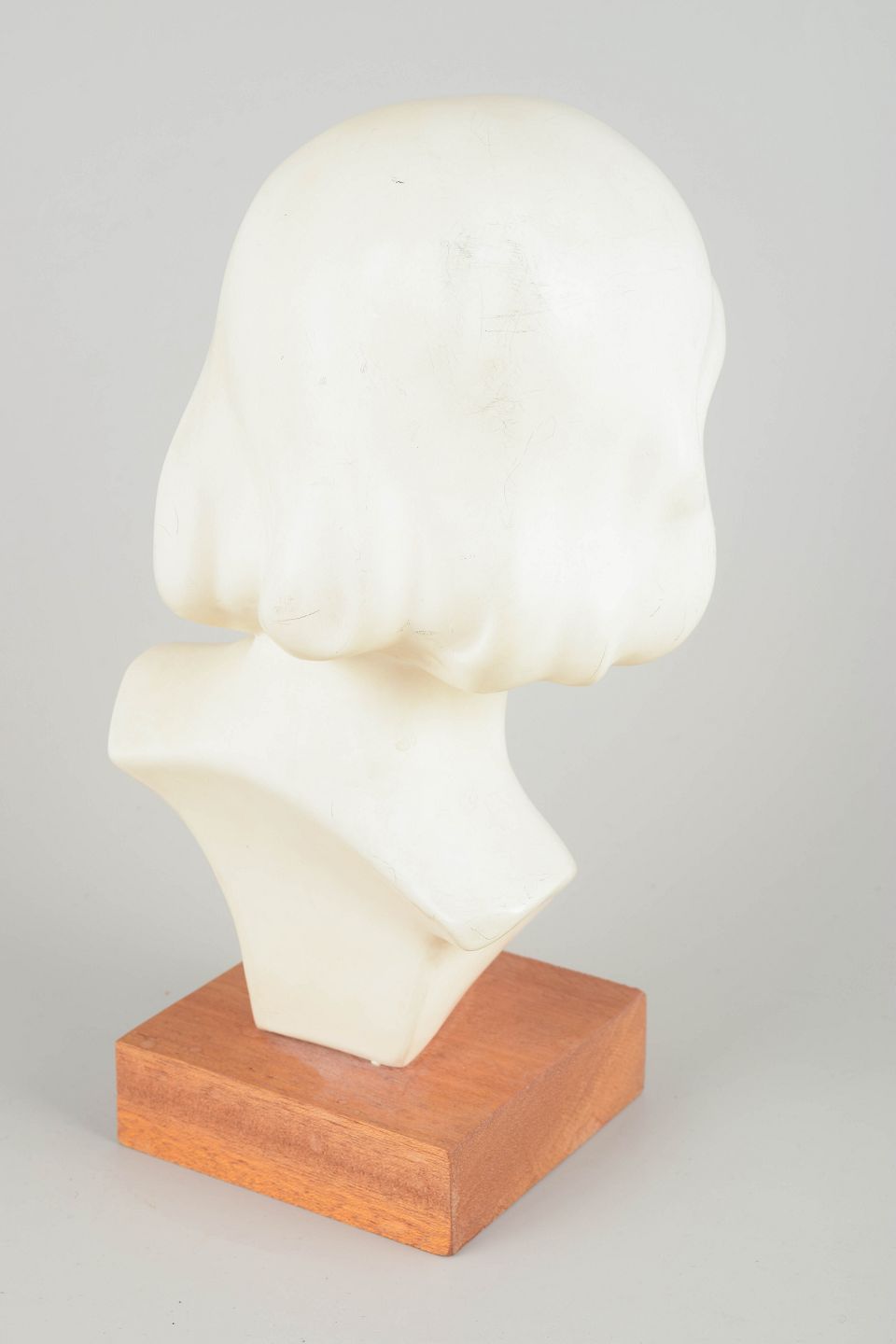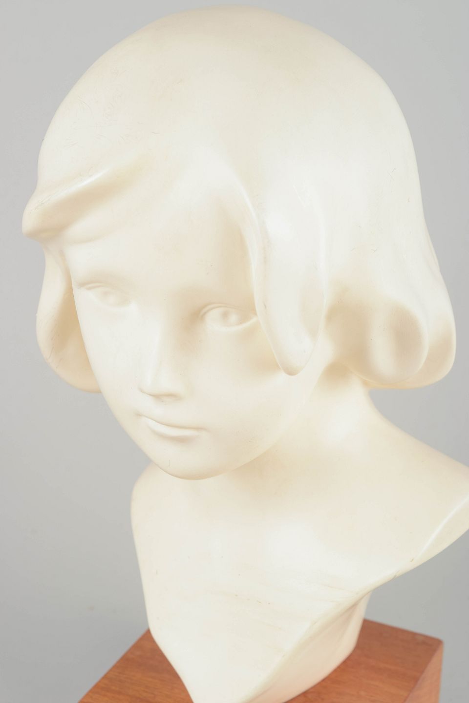 White-patinated plaster bust of a young girl on solid wooden base with original metal plaque “PÅSKLILJAN”. Classic naturalistic expression with a soft, matte surface.