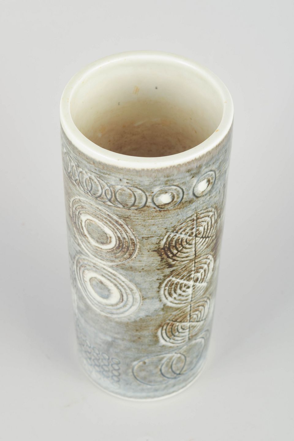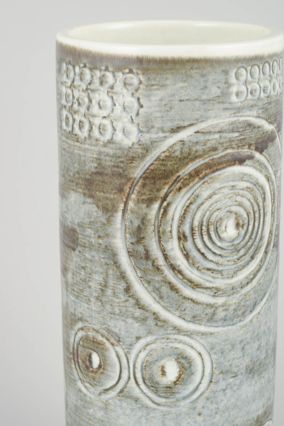 Hand-thrown cylindrical stoneware vase with engraved circular relief decoration and a matte grey-blue glaze in earthy tonal variation — characteristic of Andersson’s organic, nature-inspired design language.