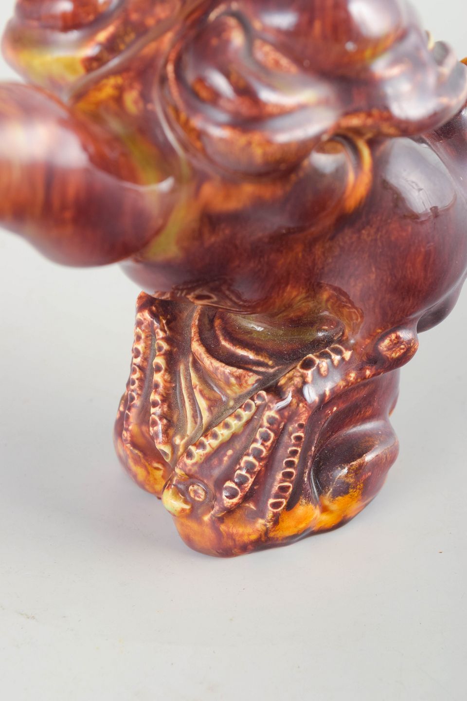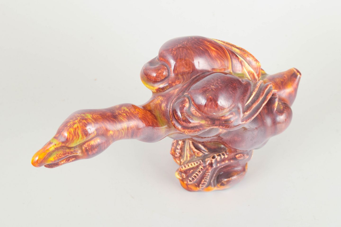 Unique hand-modelled bird figure in glazed stoneware with a vivid fiery red-orange glaze and expressive sculptural modelling. Signed with monogram underneath.