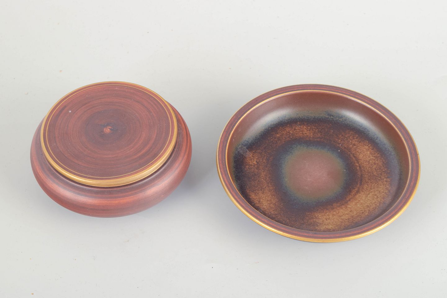 Hand-thrown ceramic set consisting of a lidded bowl and a shallow dish, both in a warm brown/golden glaze with subtle tonal shifts and an elegantly framed rim detail.