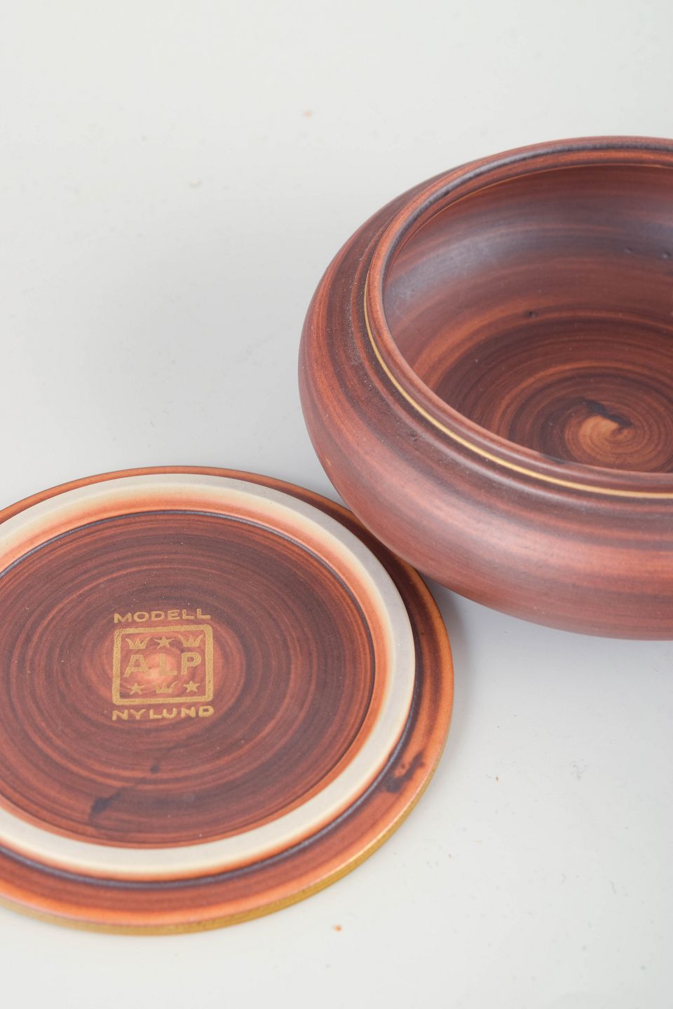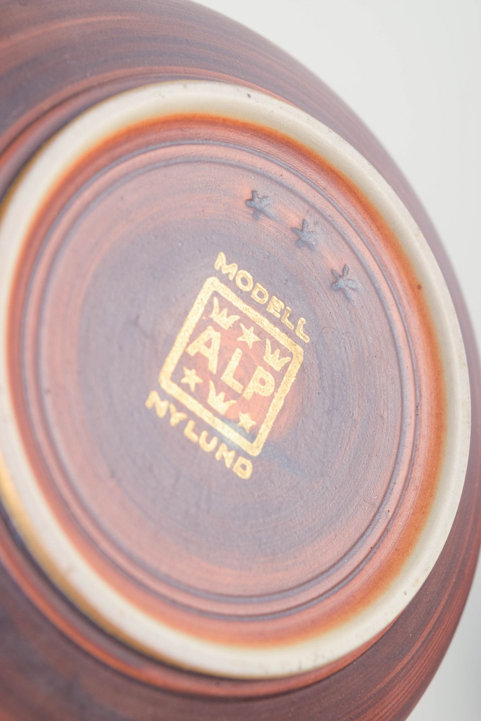Gunnar Nylund (1904–1997) was one of Scandinavia’s most influential ceramic designers, celebrated for his refined forms and sophisticated glaze work. After his renowned years at Rörstrand, he continued collaborating with Swedish workshops such as Alp in Lidköping, maintaining his signature blend of craftsmanship and restrained elegance.