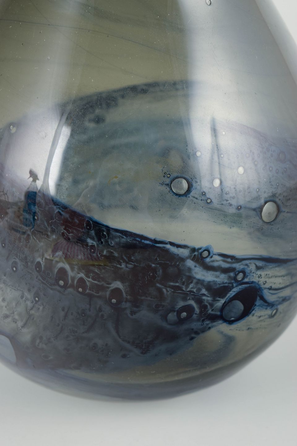 Sculptural pear-shaped studio glass vase with atmospheric, landscape-like inner colour flow in blue-grey tones, characteristic of Pukeberg’s experimental art glass production of the era.