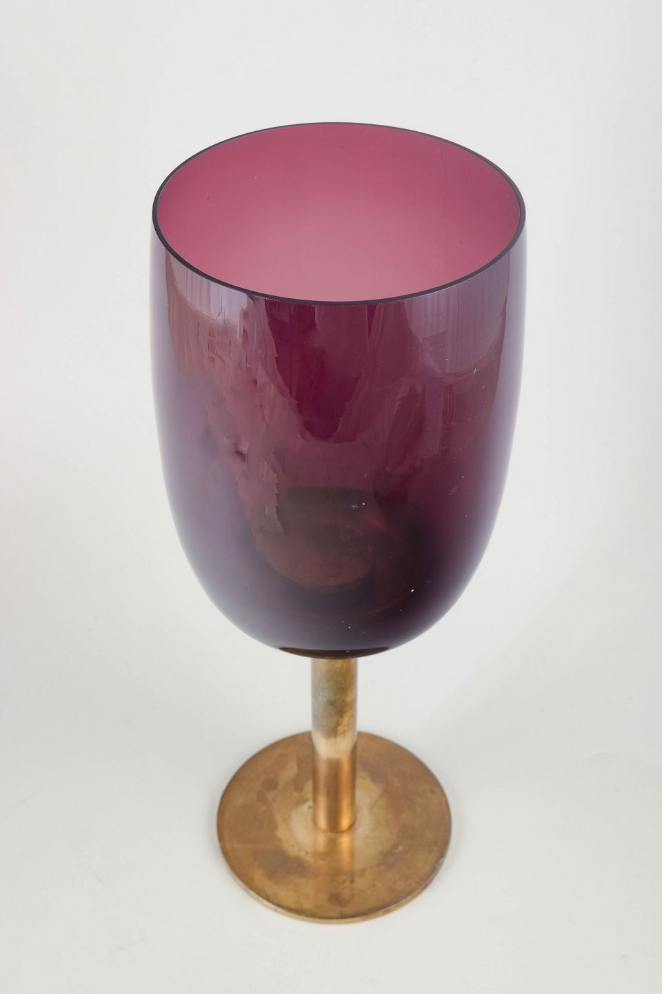 Sjælden og skulpturel lysestage i dybt violet mundblæst glas monteret på massiv messingfod. Et markant og atmosfærisk objekt med Jakobssons karakteristiske sans for lys og materialitet.
