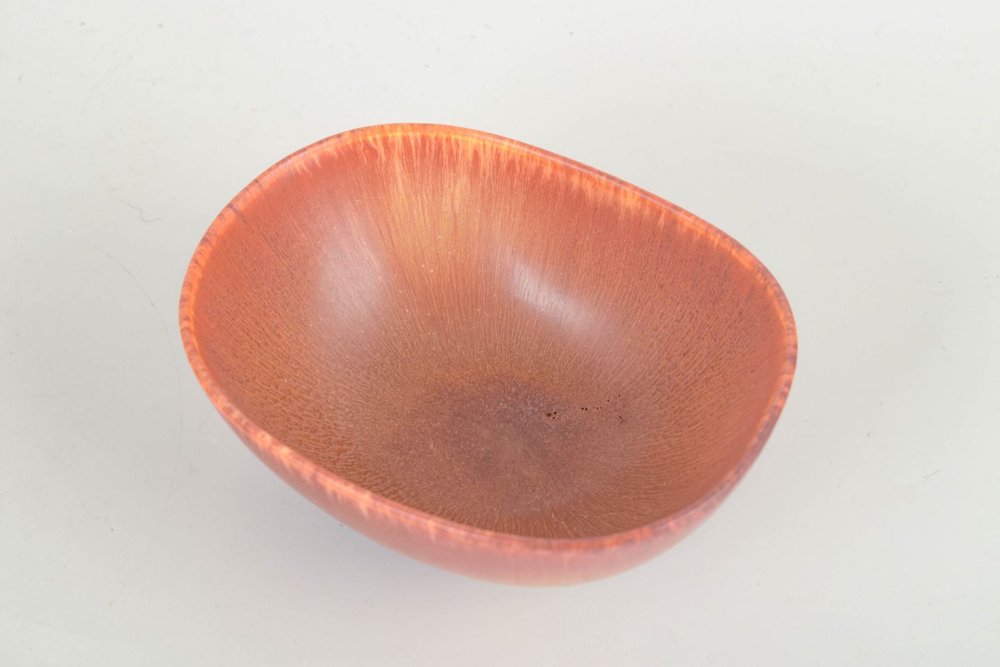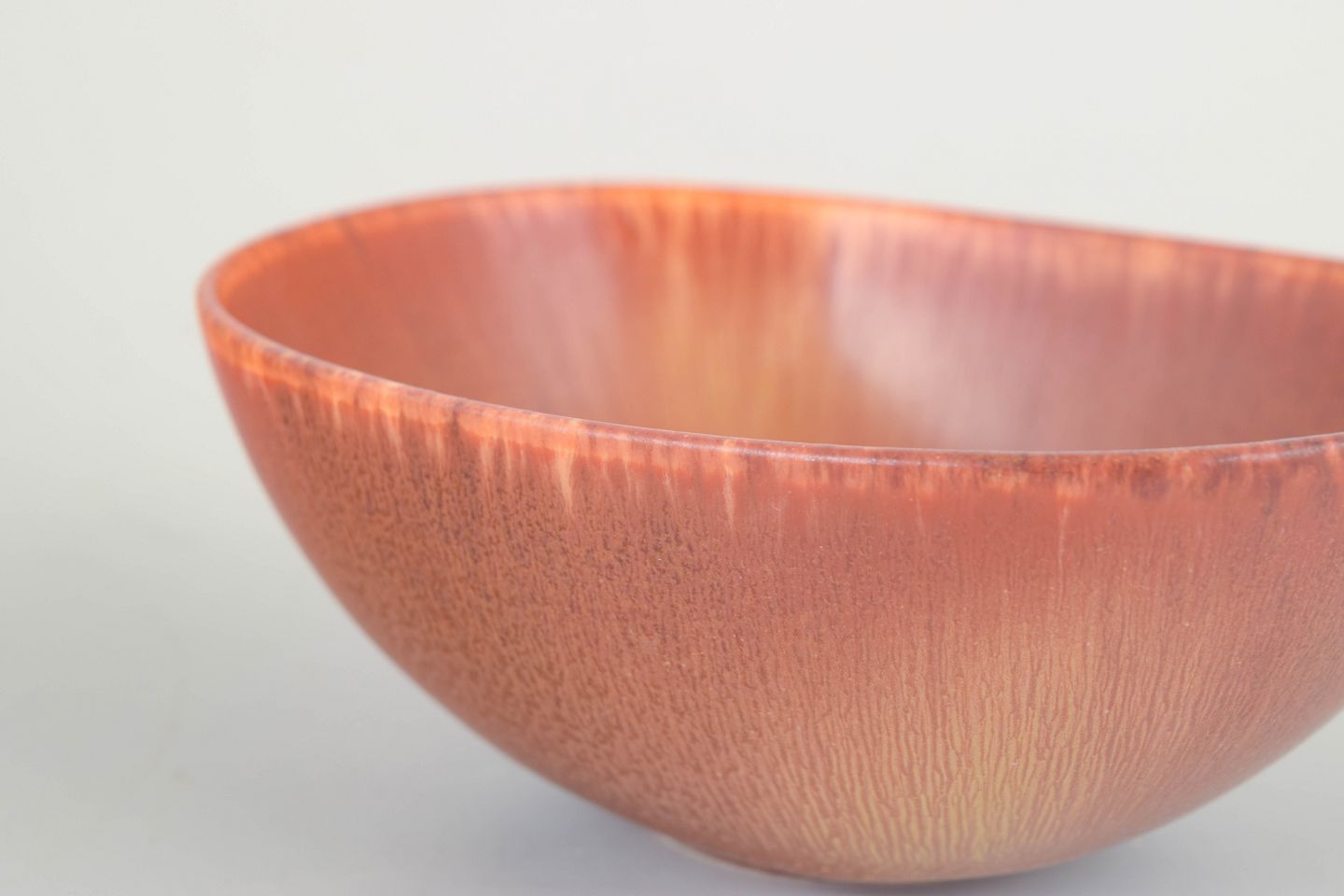 Organically shaped stoneware bowl with a gently asymmetric, softly curved form and a warm rose glaze featuring vertical flowing nuances in orange and golden tones — a refined example of Stålhane’s experimental glazing.