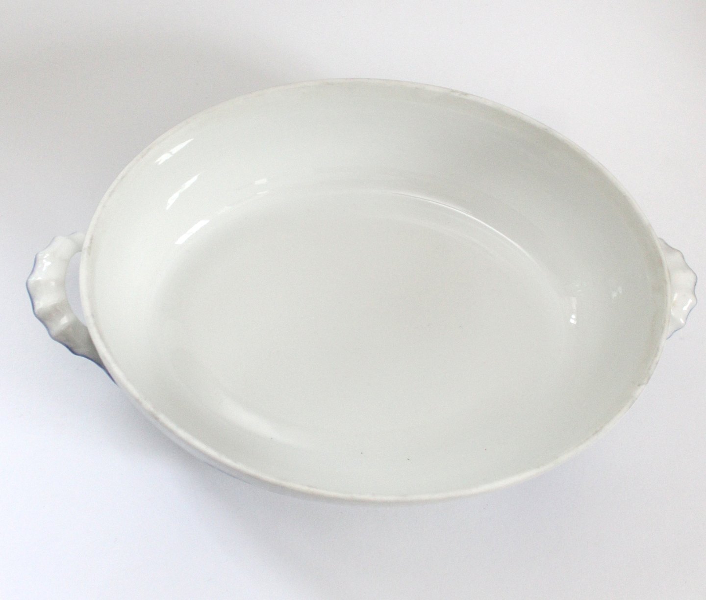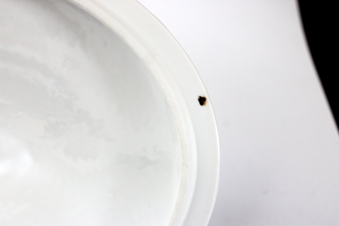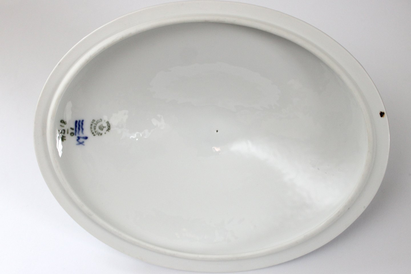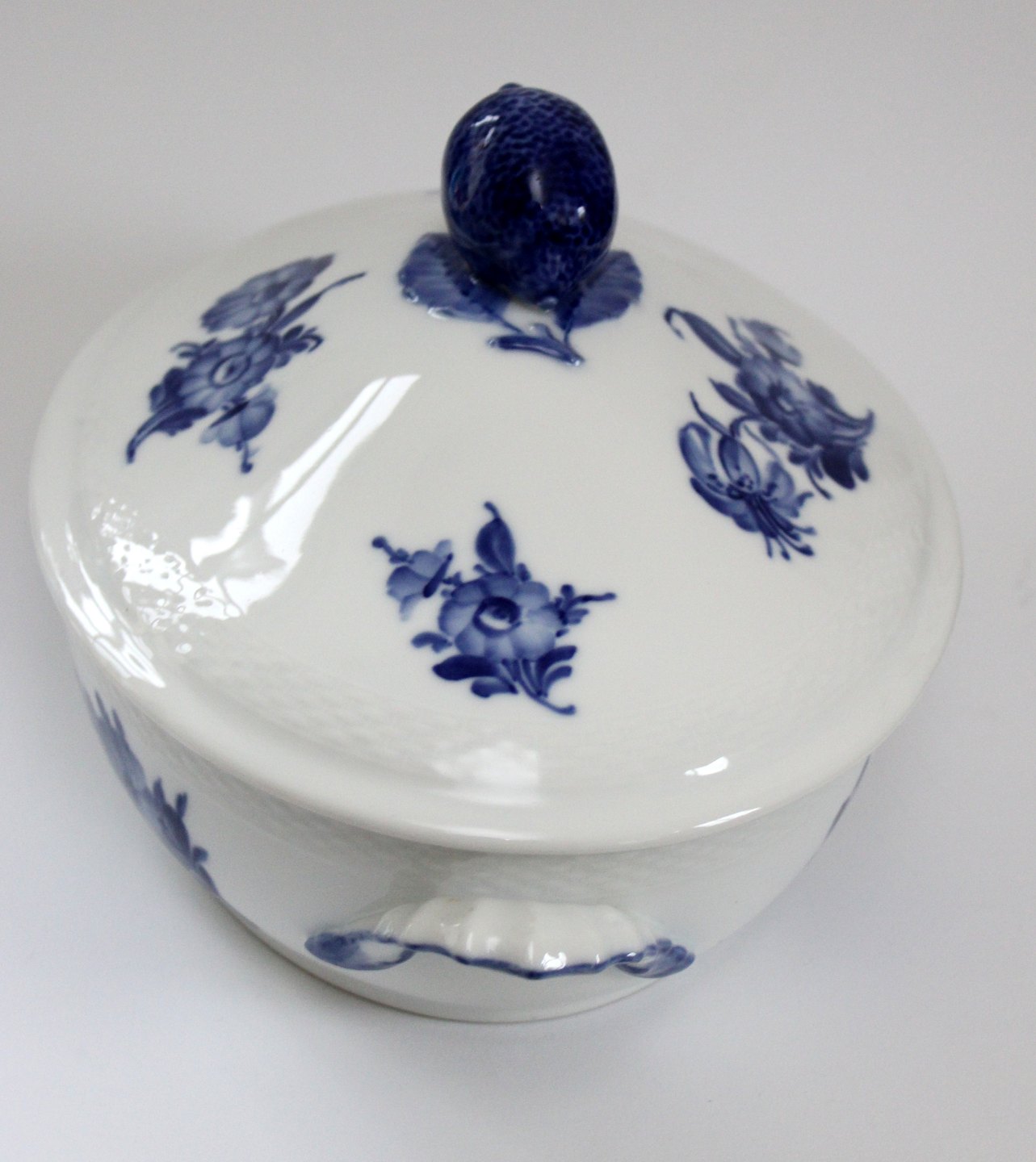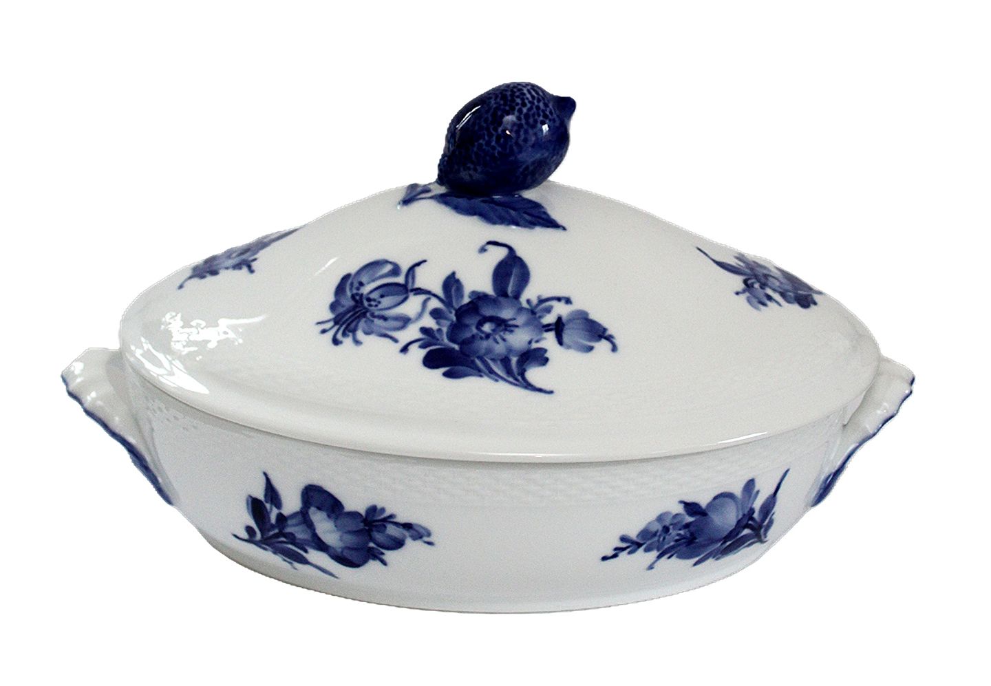 Text available in Danish: Royal Copenhagen, Blå Blomst flettet, Oval terrin med låg. Nr. 10/8172. Dateret 1945. Højde 15,5 cm. Længde 27,5 cm. Bredde 18 cm. I. sortering med sort brændingsplet på undersiden af låget. Pris: 1500 kr. stk. Lager: 1