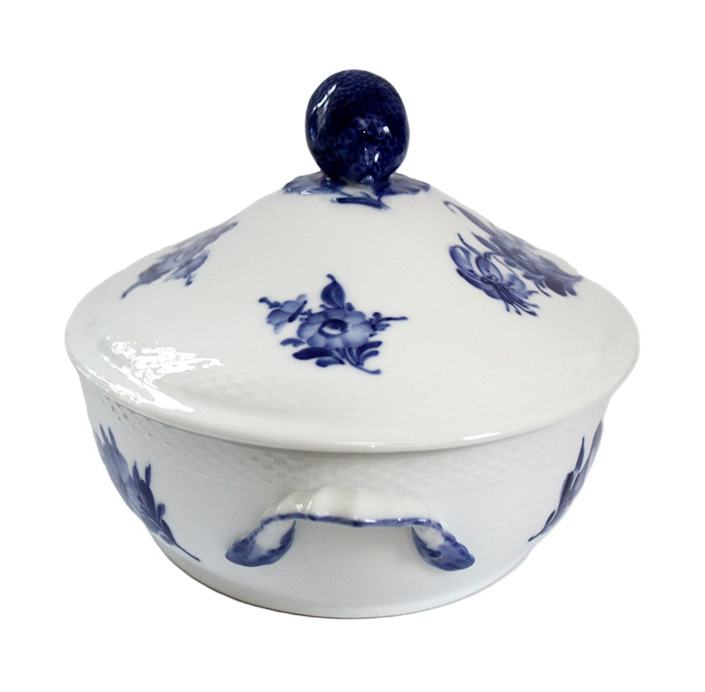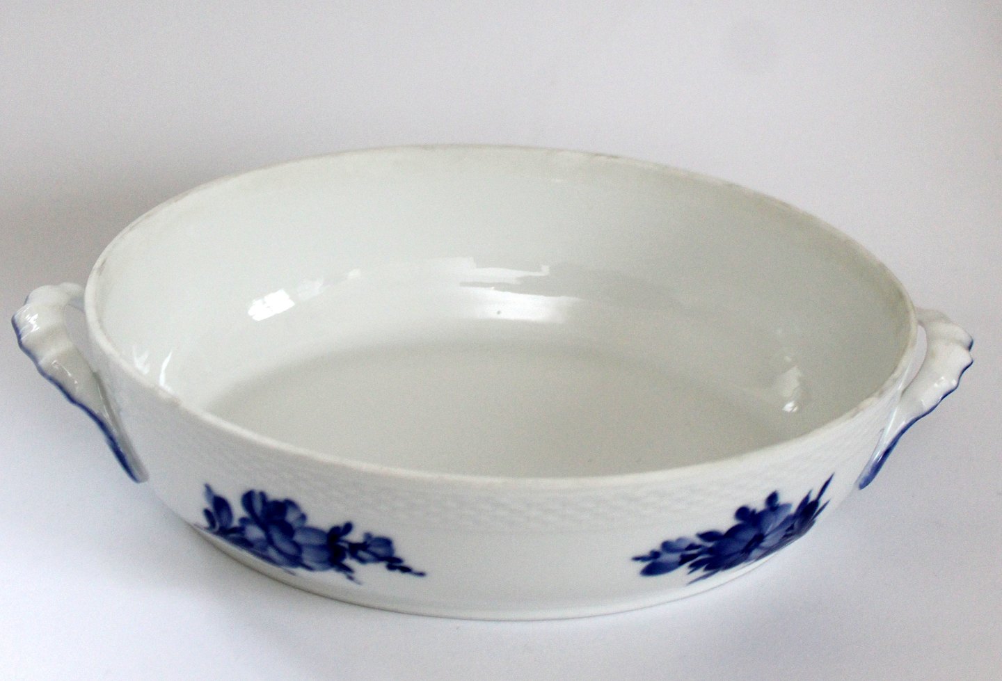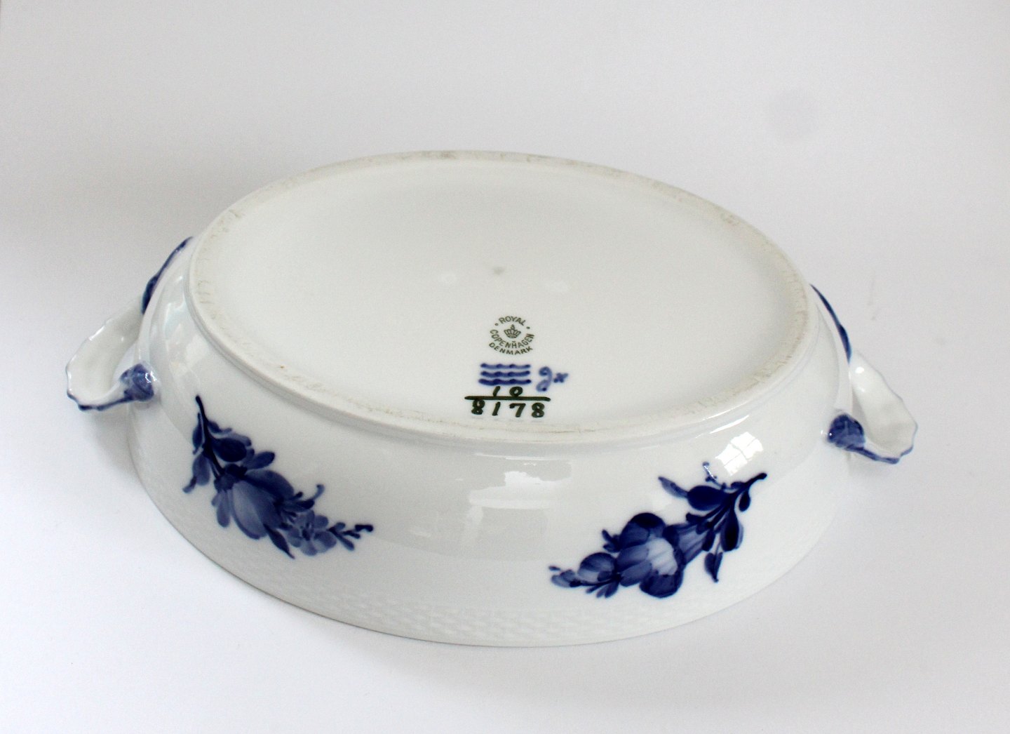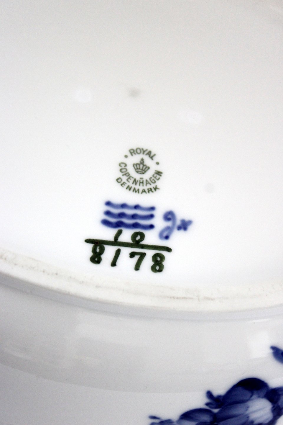 Text available in Danish: Lågterrin, Blå Blomst Flettet, Royal Copenhagen