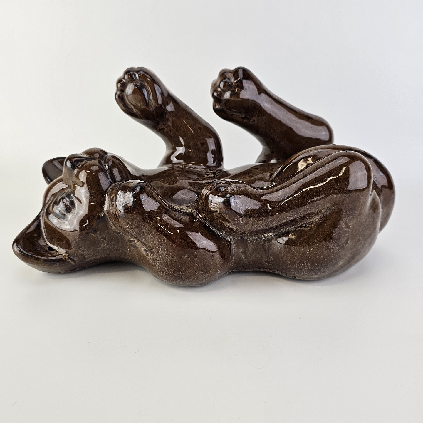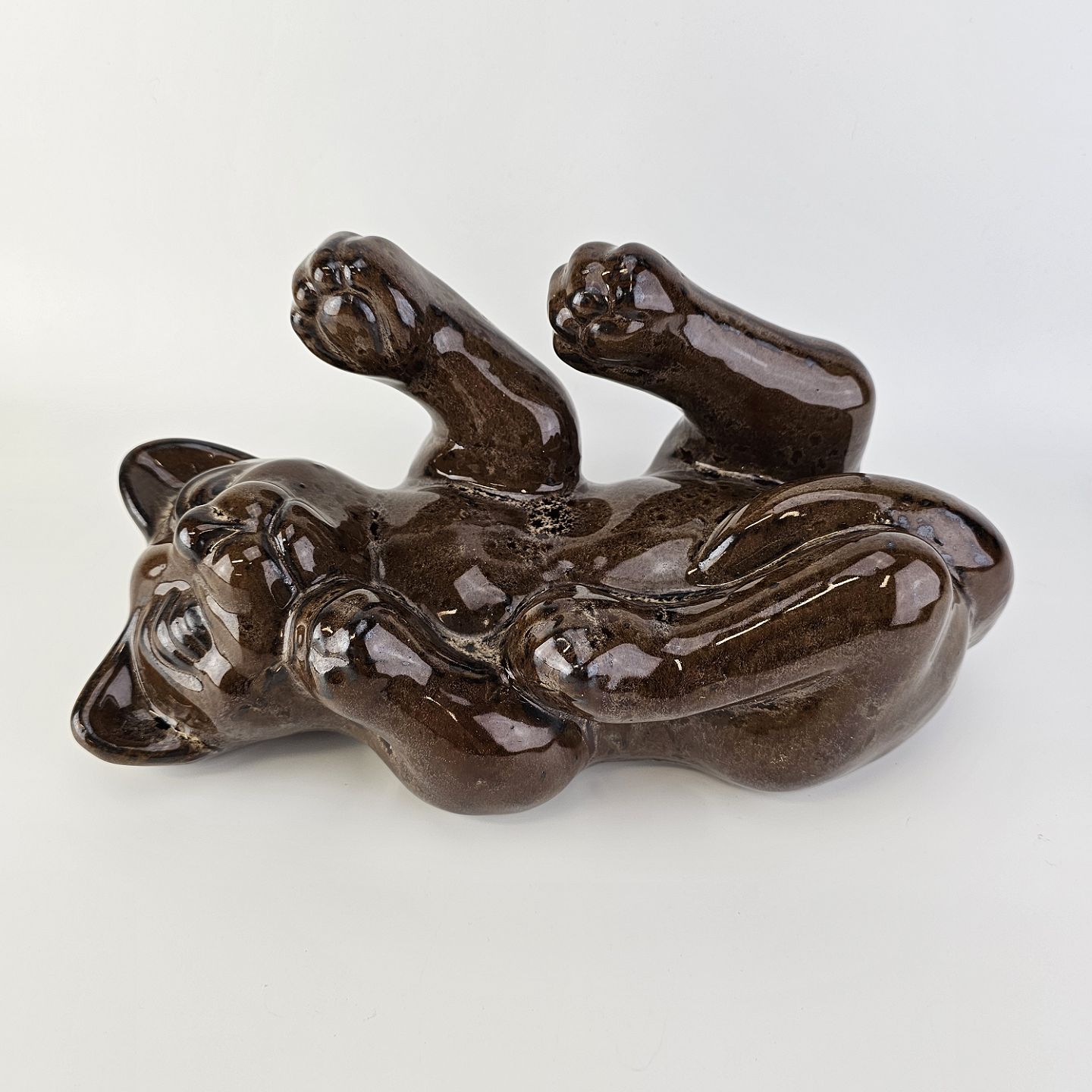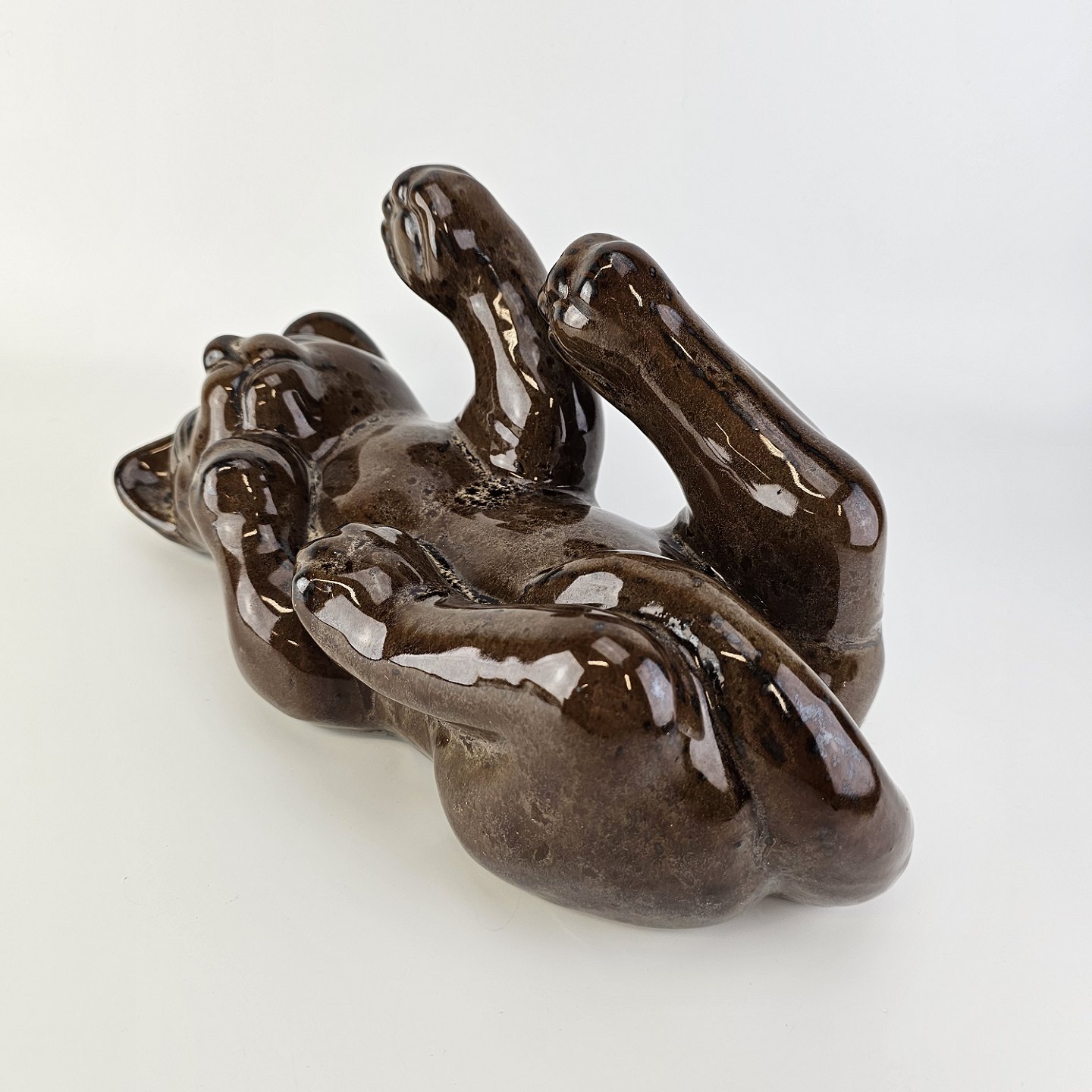 Figur i brunt glaseret lertøj med motiv af en kat som ligger på ryggen