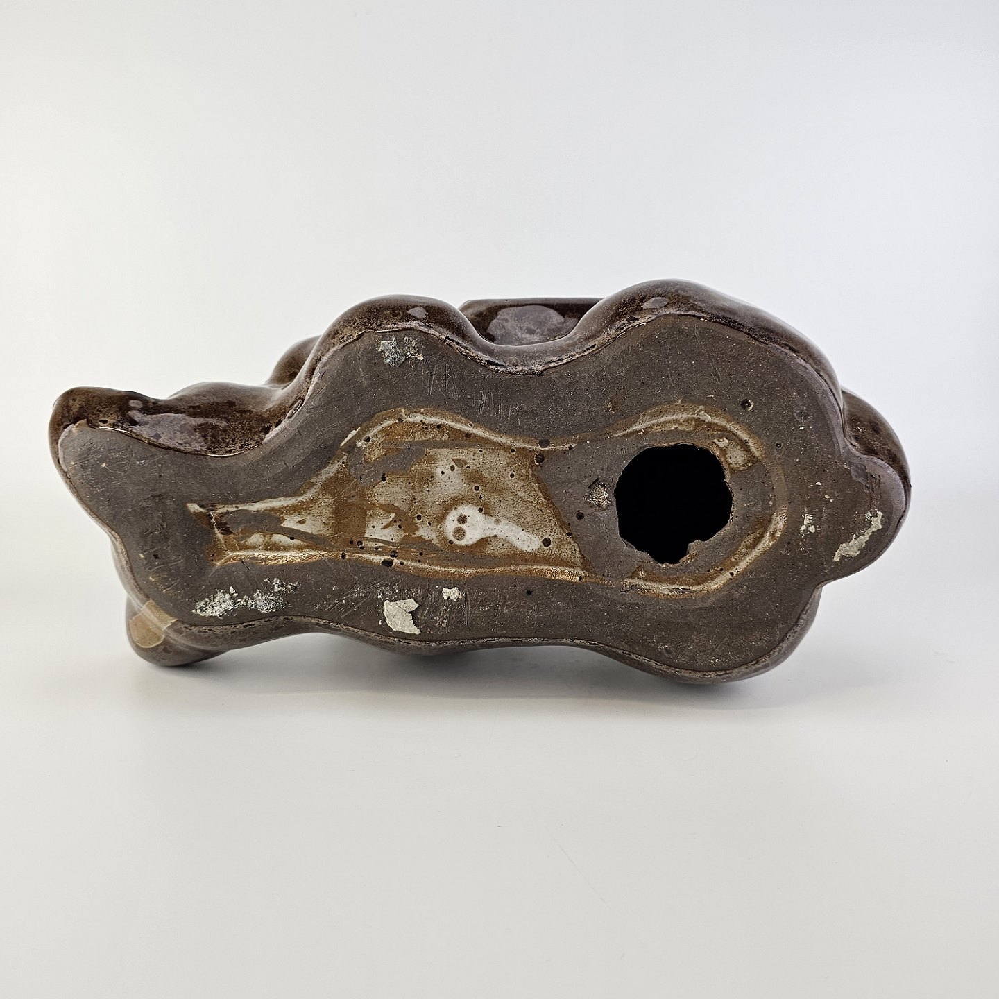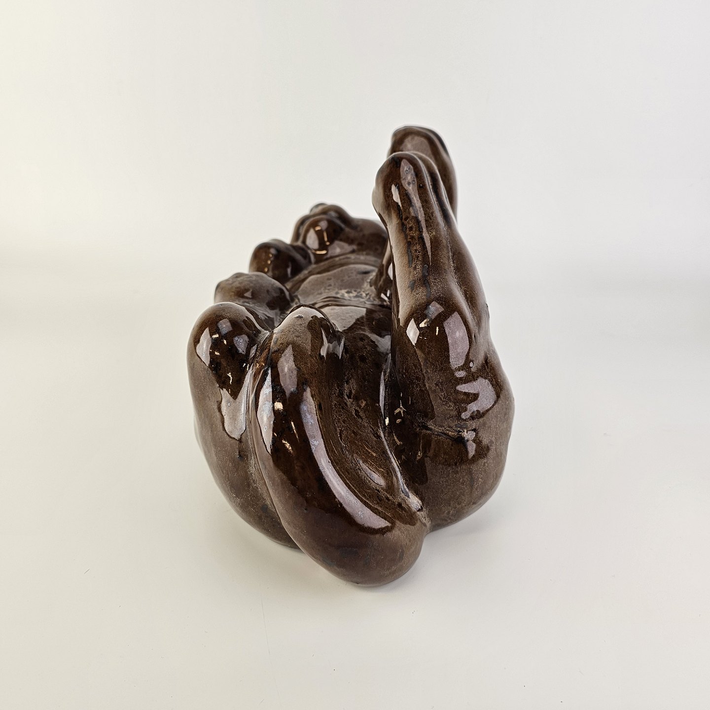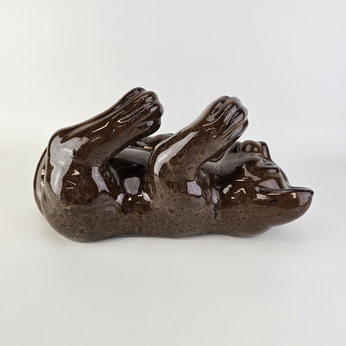 Figur i brunt glaseret lertøj med motiv af en kat som ligger på ryggen