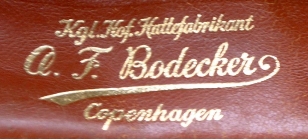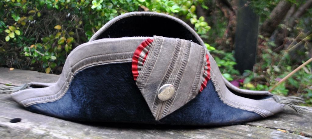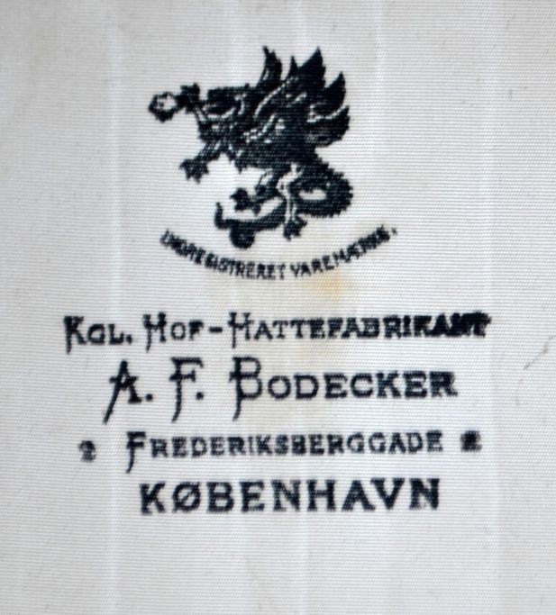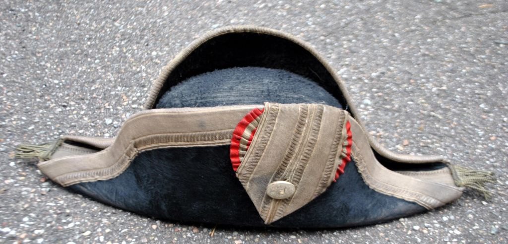 Antique "Sause Pot", Triangular hat, Border gendarme. 19th century. Denmark. Manufacturer: Royal Court hat manufacturer AF Bodecker, Frederiksbergsgade, Copenhagen. Stamped inside. L.: 43 cm. H.: 13.5 cm.