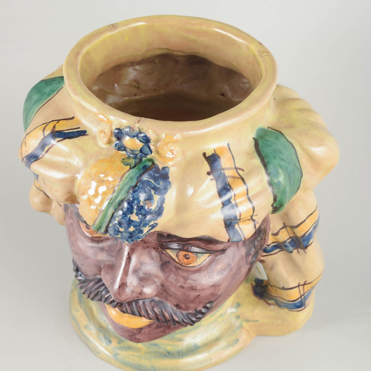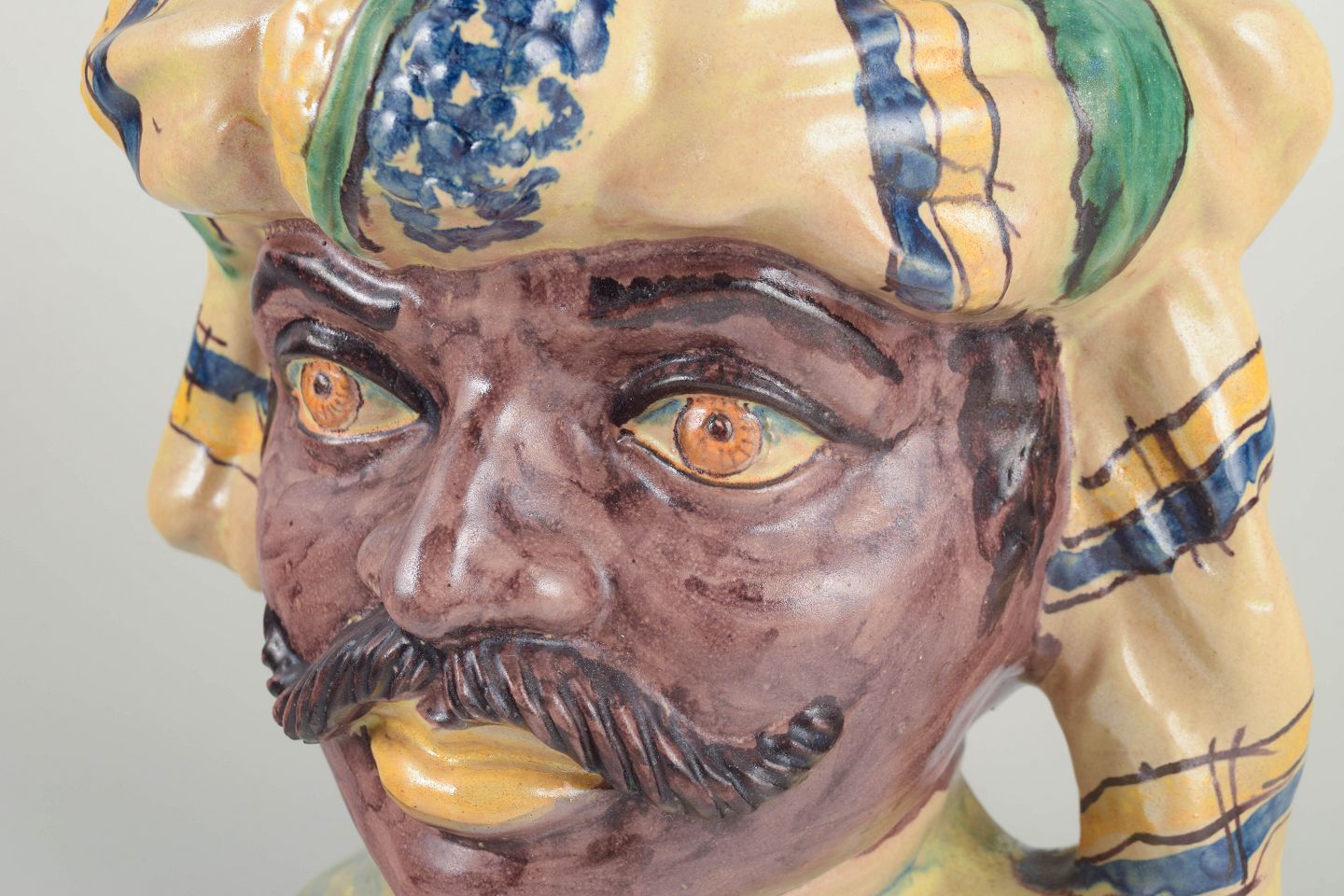 Handmade terracotta vase shaped as a male head with turban, hand-painted in vivid colours – brown, yellow, green and blue. A classic example of the Sicilian maiolica tradition from Caltagirone.