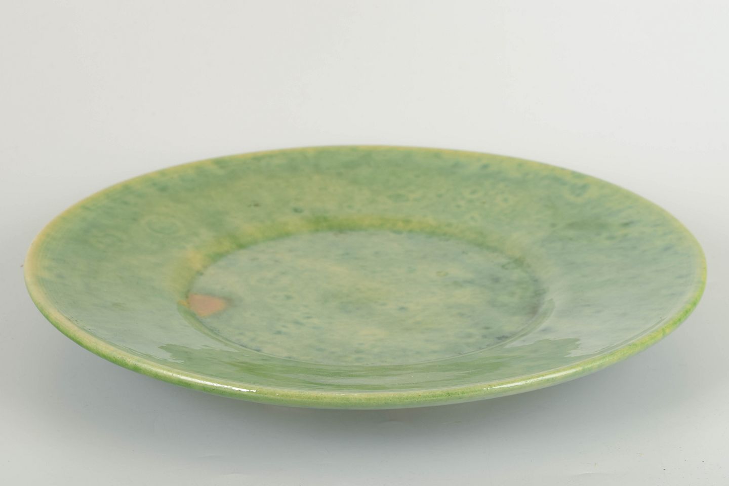 Handmade stoneware dish with vivid green glaze featuring yellow nuances and a small firing mark. Typical of the Biot studio tradition in southern France, known for rustic forms and natural glaze effects.
