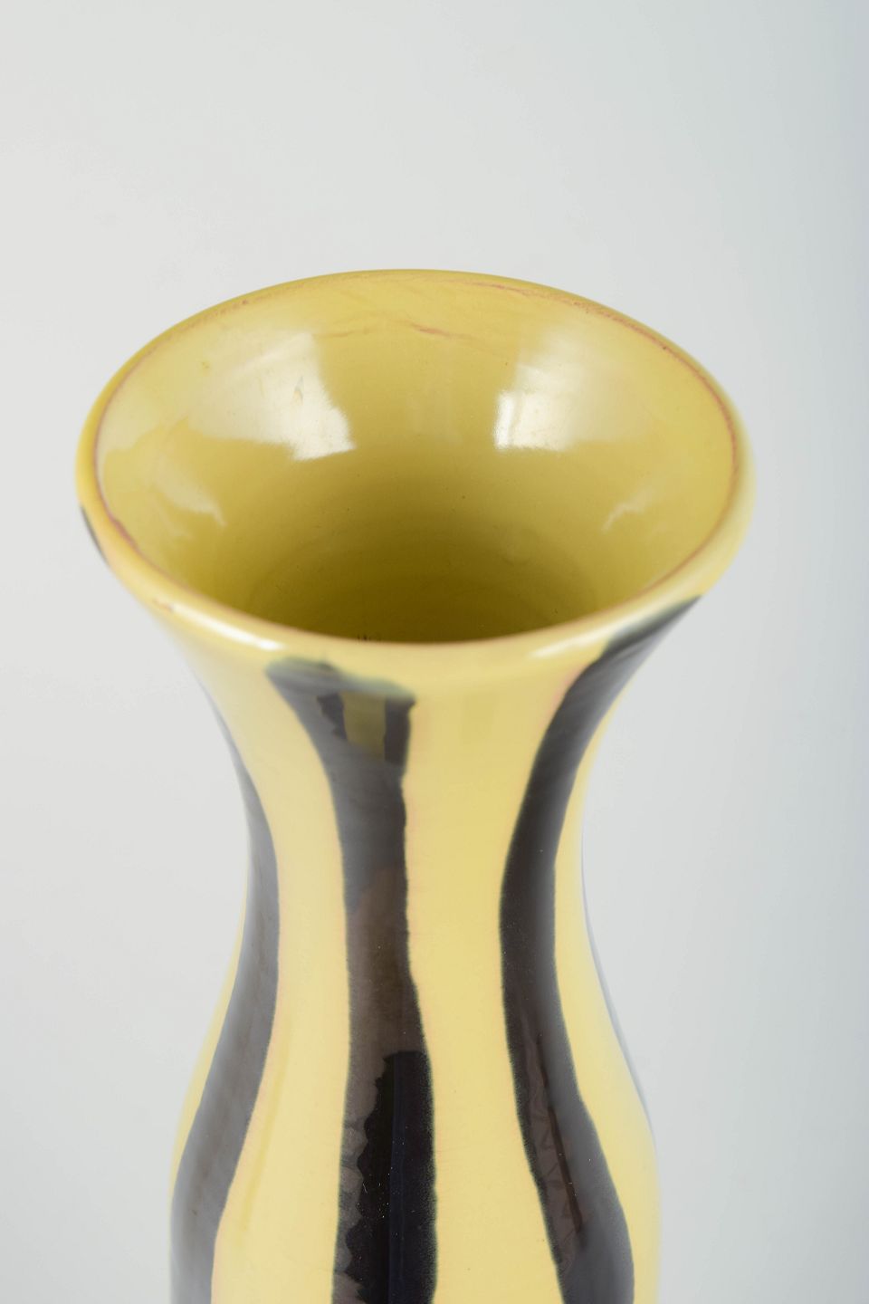 Tall, slender vase with hand-painted vertical stripes in yellow and black — a classic example of Gefle’s colourful and graphic mid-century design.