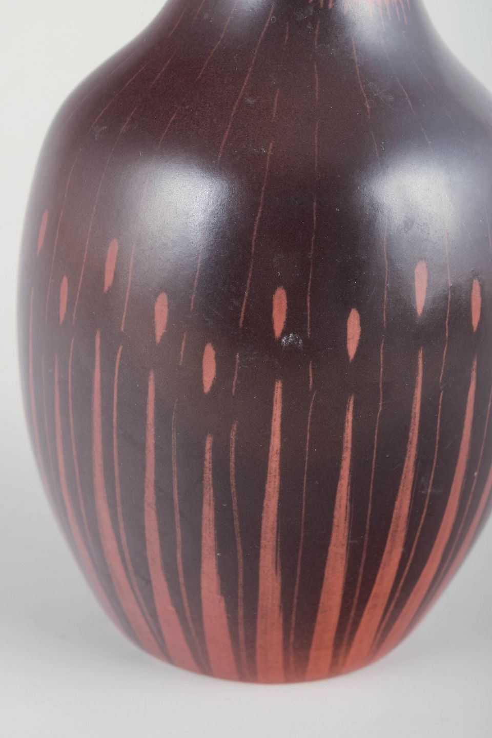 Elegant and distinctive vase in reddish and brown clay tones with hand-decorated vertical pattern and organically shaped rim. Underside marked Beswick England 1399 and signed by Colin Melbourne.