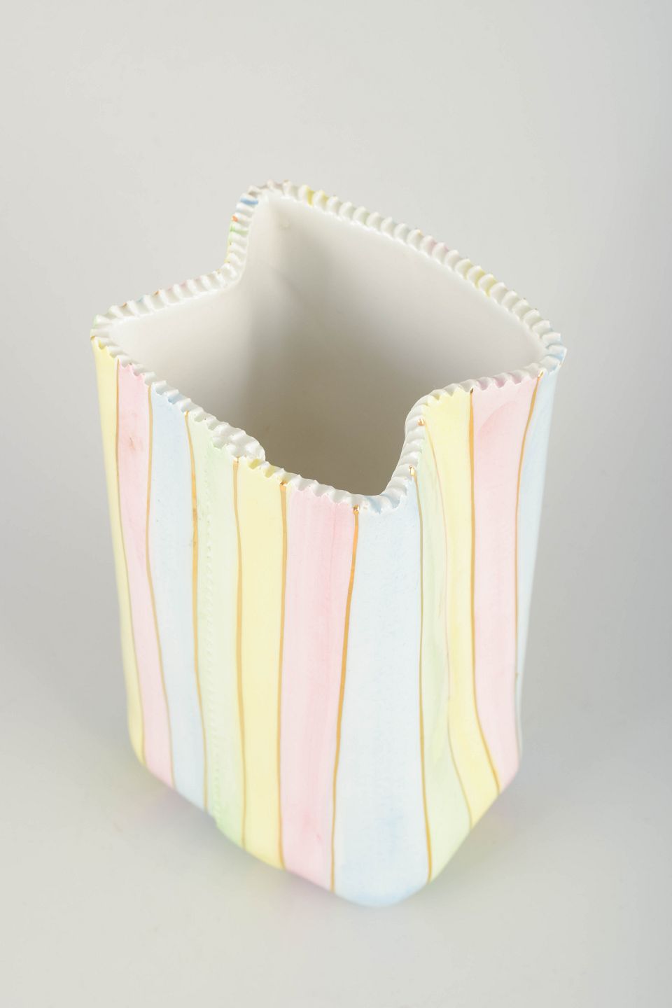 Hand-painted ceramic vase with vertical colour fields in soft pastel shades of pink, yellow, blue and green, finished with a wavy rim and a subtly asymmetric shape. A playful and decorative expression, typical of the experimental Scandinavian studio ceramics of the era.