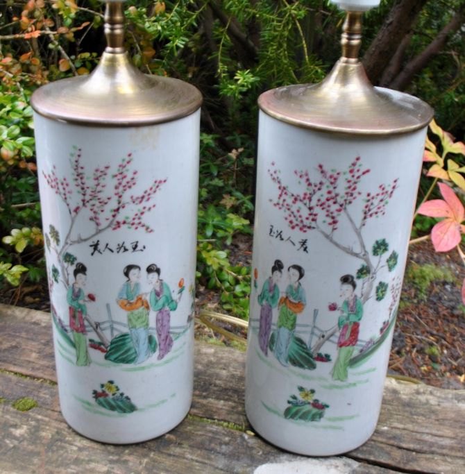 Pair of Chinese porcelain hat stands, 19th century. Converted into table lamps. Hand-painted polychrome decorations of a woman in a garden. With text in Chinese. H.: 29 cm. Height with electrical installation: 53 cm.