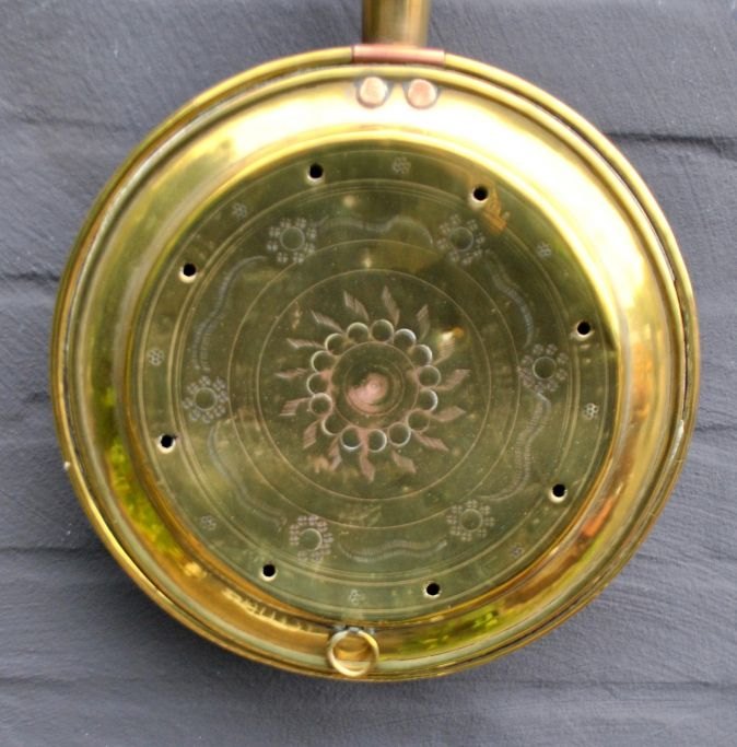 Dansk varmebækken i messing, 18. årh. Låg med dekorationer af blomster. Egetræs skaft. L.: 106 cm. Nækken diameter: 27 cm.