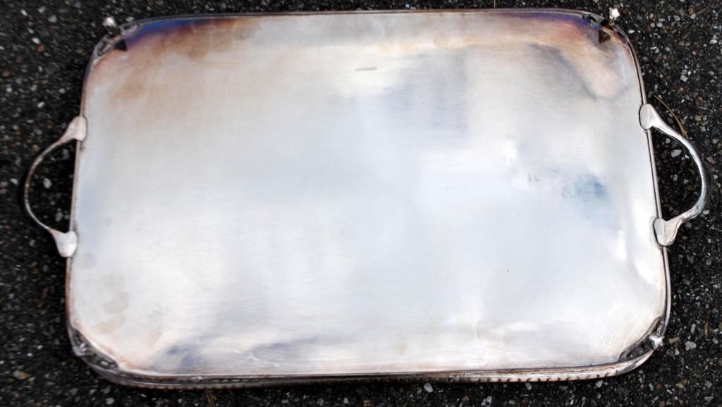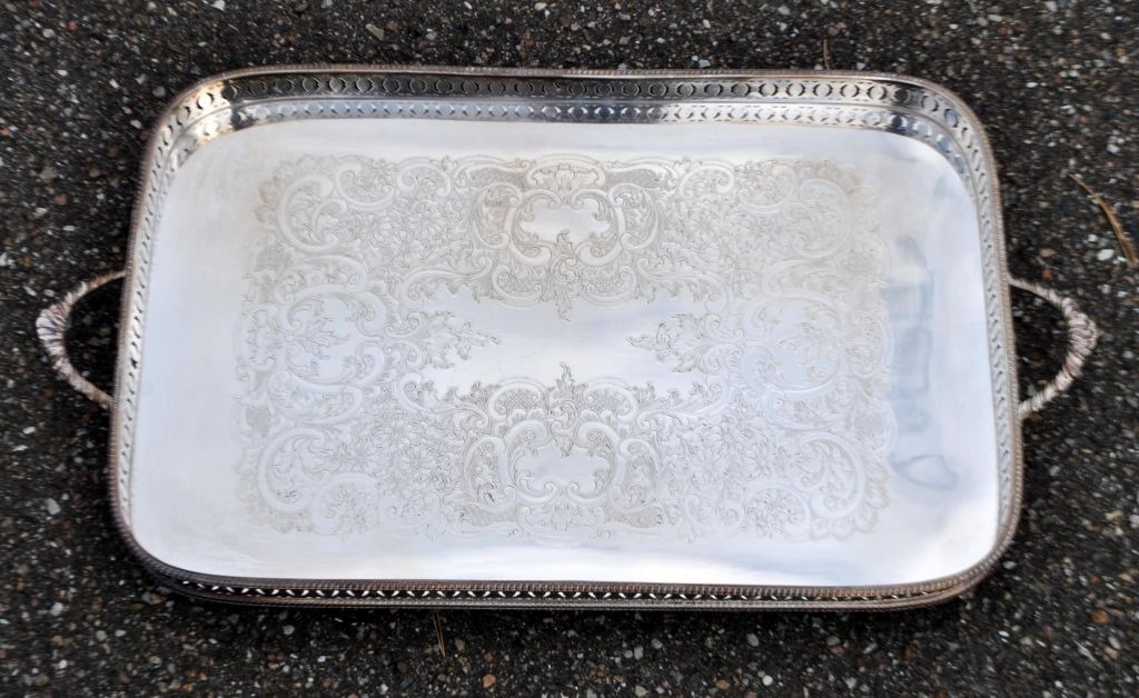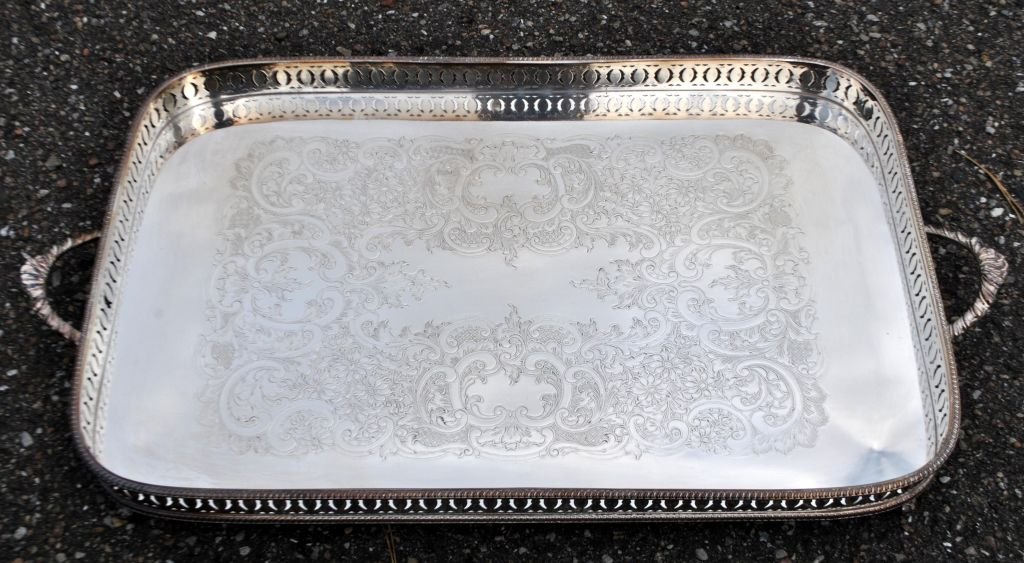 Large English silver-plated serving tray, 20th century. With openwork edge and two handles. Base with rococo decorations. On four claw & ball. Stamped: Silver on cupper. 46.5 x 31 cm.