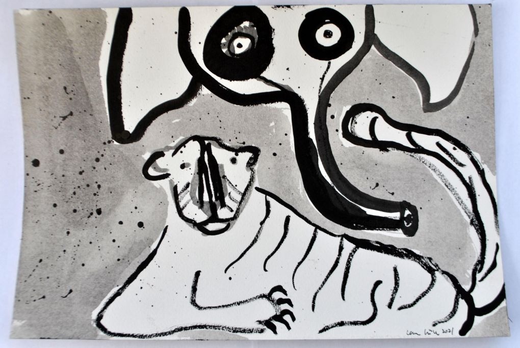 Kühl, Lena (1950 -) Denmark: Tiger and elephant, 2021. Ink on paper. Signed: Lena Kühl 2021. H. 25 cm. W: 36 cm.