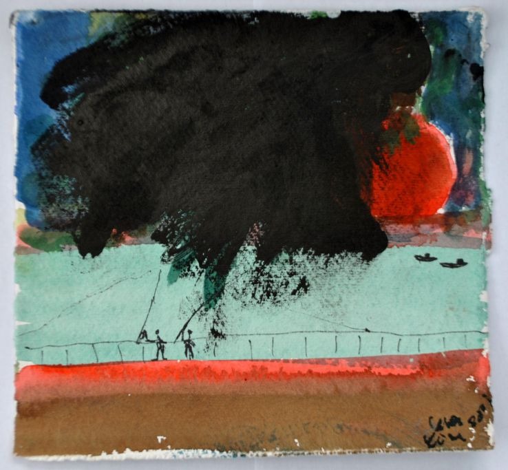 Kühl, Lena (1950 -) Denmark: Fishermen, 2001. Watercolor on paper. Signed: Lena Kühl 2001. H: 18 cm. W: 19 cm.