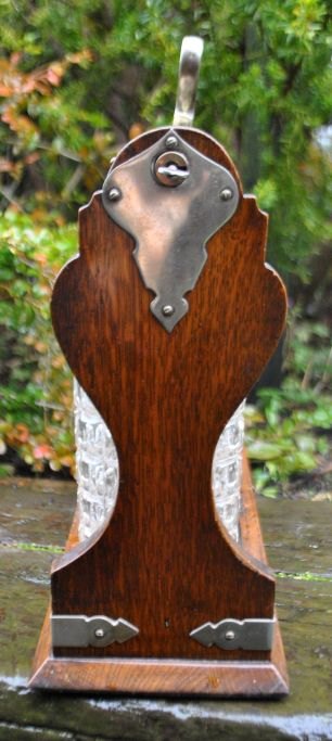 Engelsk tantalus med tre krystal karafler, 19. årh. Poleret egetræ. Med messingbeslag og lås med nøgle. H: 32,5 cm. L: 35 cm.